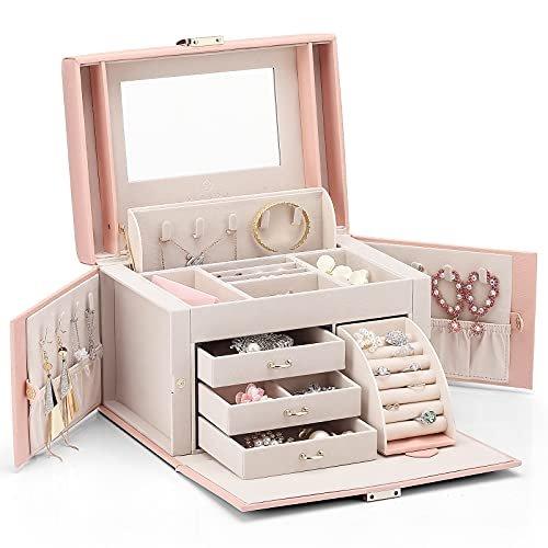 Schmuckkästchen im Barockstil: Im geschlossenen Zustand hat das Schmuckkästchen eine schlichte Fassade, einen glänzenden Metallverschluss und einen sicheren Griff. Beim Öffnen verwandelt sich das Schmuckkästchen in einen attraktiven Palast. Vielseitige Schmuckaufbewahrung: Das beigefarbene Schmuckkästchen mit historischen Maßen (25 cm x 18 cm x 17 cm) hat 6 Teile, darunter 3 Schubladen. Es hilft Ihnen, alle Ihre Schmuckstücke zu finden und alles ordentlich aufzubewahren. Langlebig und robust: Die Schmuckschatulle besteht aus hochwertigem Kunstleder, ist mit Samt gefüttert und hat einen feinen Metallverschluss. Sie sorgt dafür, dass sie Sie lange Zeit begleiten kann und gleichzeitig Ihren Schmuck gut aufbewahrt. Eingebauter Make-up-Spiegel und Tragegriff: In der Schmuckschatulle befindet sich ein harter und klarer Make-up-Spiegel, so dass Sie Ihre Schönheit schneller sehen können, wenn Sie Ihren Lieblingsschmuck tragen. Das tragbare Design macht es einfach, die Box zu bewegen.