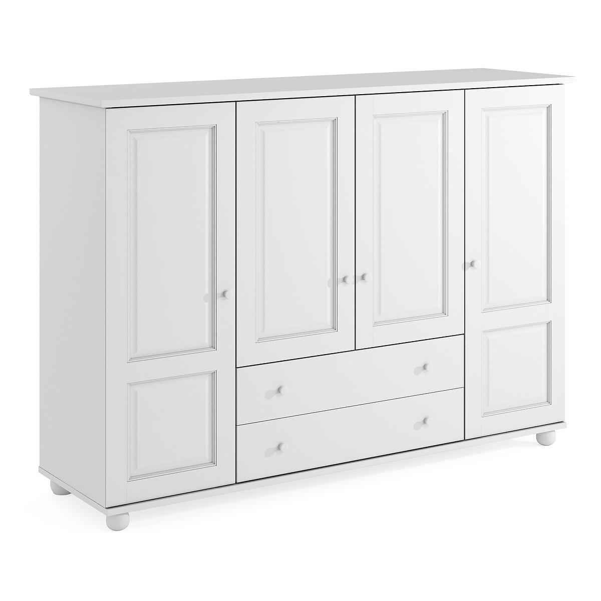 Kleiderschrank Redmond aus Kiefer massiv mit 4 Türen und 2 Schubladen. Dieses praktische Möbelstück mit Kleiderstange und Einlegeböden beansprucht selbst wenig Platz, bietet aber umso mehr Platz für Ihre Garderobe. Die Höhe von 120 cm ist perfekt geeignet, um den Platz unter einer Dachschräge auszunutzen!