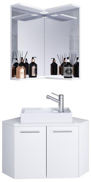 Das moderne Set besteht aus einem Waschbecken mit Waschbeckenunterschrank sowie einem Eckspiegel und bietet die perfekte Einrichtungslösung für WCs oder auch Gästetoiletten.