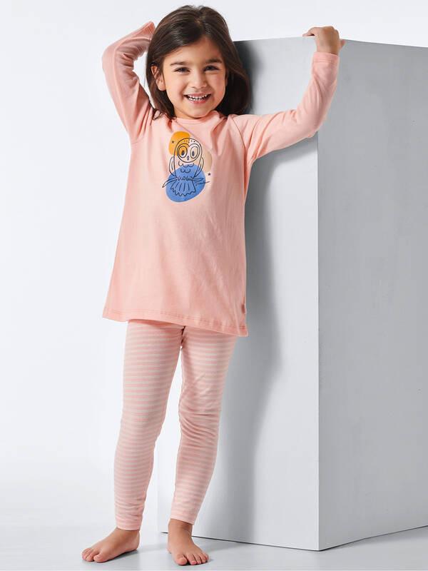 Dieser Pyjama von Schiesser bietet eine bequeme Passform, perfekt für einen erholsamen Schlaf. Das Set besteht aus einem langärmeligen Oberteil mit Eulen-Print auf der Vorderseite und einer passenden gestreiften Hose, die für Bewegungsfreiheit und Weichheit auf der Haut sorgt.