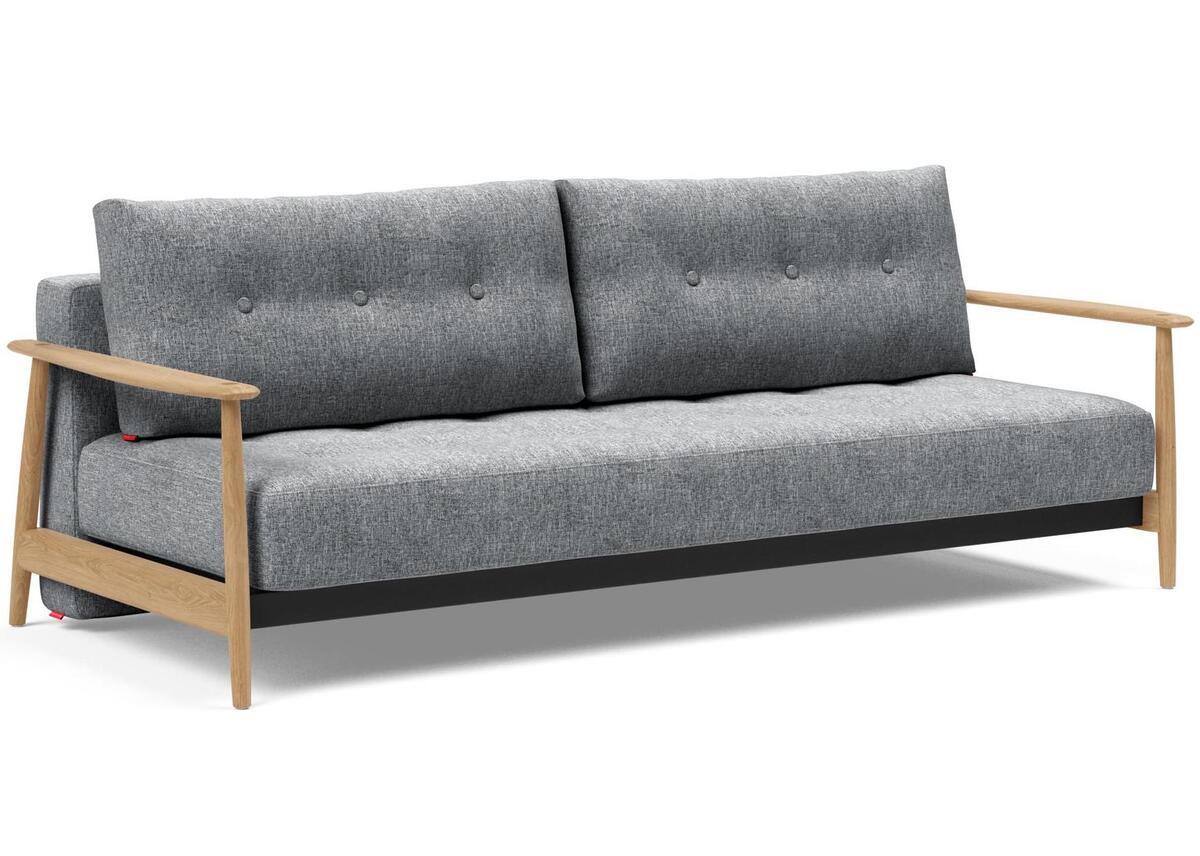 Eluma Deluxe ButtonDesign by Per Weiss, Oliver & Lukas WeissKrogh 2016Die dänische Marke Innovation Living steht für multifunktionelle Sofas, die Ästhetik, Funktionalität und Komfort verbinden und gleichzeitig bezahlbar sind. Das Aussehen eines multifunktionalen Sofas soll genauso attraktiv sein wie ein Standard Sofa. Somit machen die Sofas überall eine gute Figur und stellen insbesondere eine attraktive Lösung dar, um mehr Raum zu schaffen, wo der Raum knapp ist. Sei es in der Ferienwohnung oder in Ihrem zu Hause für Übernachtungsgäste. Mit einem Sofa von Innovation Living gehen Sie keine Kompromisse ein. Sie kaufen ein vollwertiges Design Sofa, das sich mit wenigen Handgriffen in ein (fast) genauso vollwertiges Bett umfunktionieren lässt. Die hochwertigen Bettsofas von Innovation Living sind für den Vielgebrauch konzipiert und bieten einen entsprechend hohen Liegekomfort.Umrahmt von Armlehnen aus Natureiche zeigt sich Eluma im nordisch inspiriertem Design. Die federgefüllten Kissen und die Taschenfedernkernmatratze, die für Sitz und Rücken zum Einsatz kommen, garantieren Ihnen und Ihren Gästen ein komfortables Sitz- und Liegeerlebnis. Enftfernen Sie die Kissen, um das Sofa als Einzelbett zu verwenden oder ziehen Sie das Untergestell heraus und klappen Sie die Rückenlehne herunter, um ein komfortables Doppelbett mit den Abmessungen 140 x 200 cm zu erhalten, das ausreichend Platz für 2 Personen bietet.Sofagrösse: 96 x 223 cmBettgrösse: 140 x 200 cmKissen: 95 x 42 x 19 cm (B x H x T)Rahmen: Stahl, mattschwarzFuss: Eiche, lackiertKomfort: Federkern, festMaximale Belastbarkeit: 330 kgAbstand zwischen Boden und Gestell: 12 cmHinweis: Die Knöpfe an den Rückenkissen sind selbst zu befestigen. Diese sind nicht fix angenäht, damit der Bezug abgezogen werden kann um z.B. eine Handwäsche vorzunehmen oder den Bezug bei Bedarf ersetzen zu können. Besuchen Sie hier den Innovation