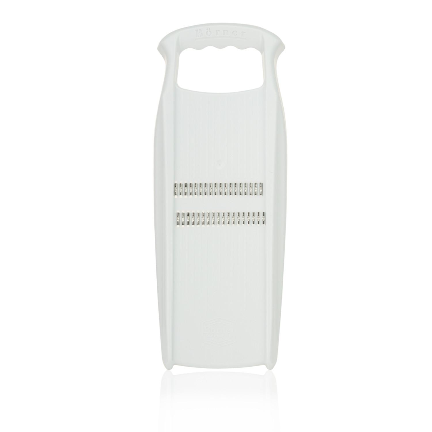 Mit der original Börner Roko-Reibe können Sie Obst und Gemüse in feine dünne Julienne-Streifen schneiden. Unser Julienneschneider schneidet Wurzelgemüse wie Karotten, Sellerie, Pastinaken oder Kohlrabi, aber auch Kartoffeln oder Gurken lassen sich reiben und zu feinen Julienne-Streifen z. B. für Rohkost-Salate verarbeiten. Die beidseitig geschliffenen Klingenreihen schneiden in kürzester Zeit große Mengen, da in beide Richtungen geschnitten werden kann. Perfekt geeignet ist der Julienneschneider für die Zubereitung von Gemüsepfannen wie z. B. Wokgemüse. Außerdem kann die Roko Powerline ideal als Zucchini Spaghetti Schneider verwendet werden und leckere Gerichte zaubern.