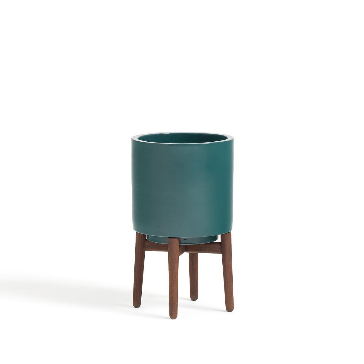 Ein dekorativer Übertopf aus Keramik mit einem klappbaren Holzständer. Er setzt Topfpflanzen effektvoll in Szene.