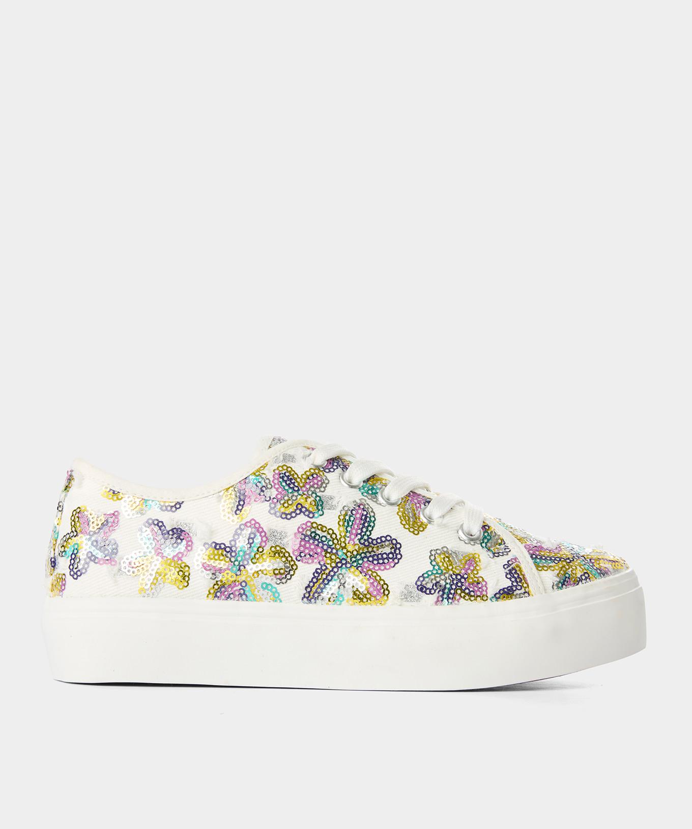 Knallige Pailletten verleihen diesen floralen Canvas-Schuhen eine lebendige, frühlingshafte Ausstrahlung.