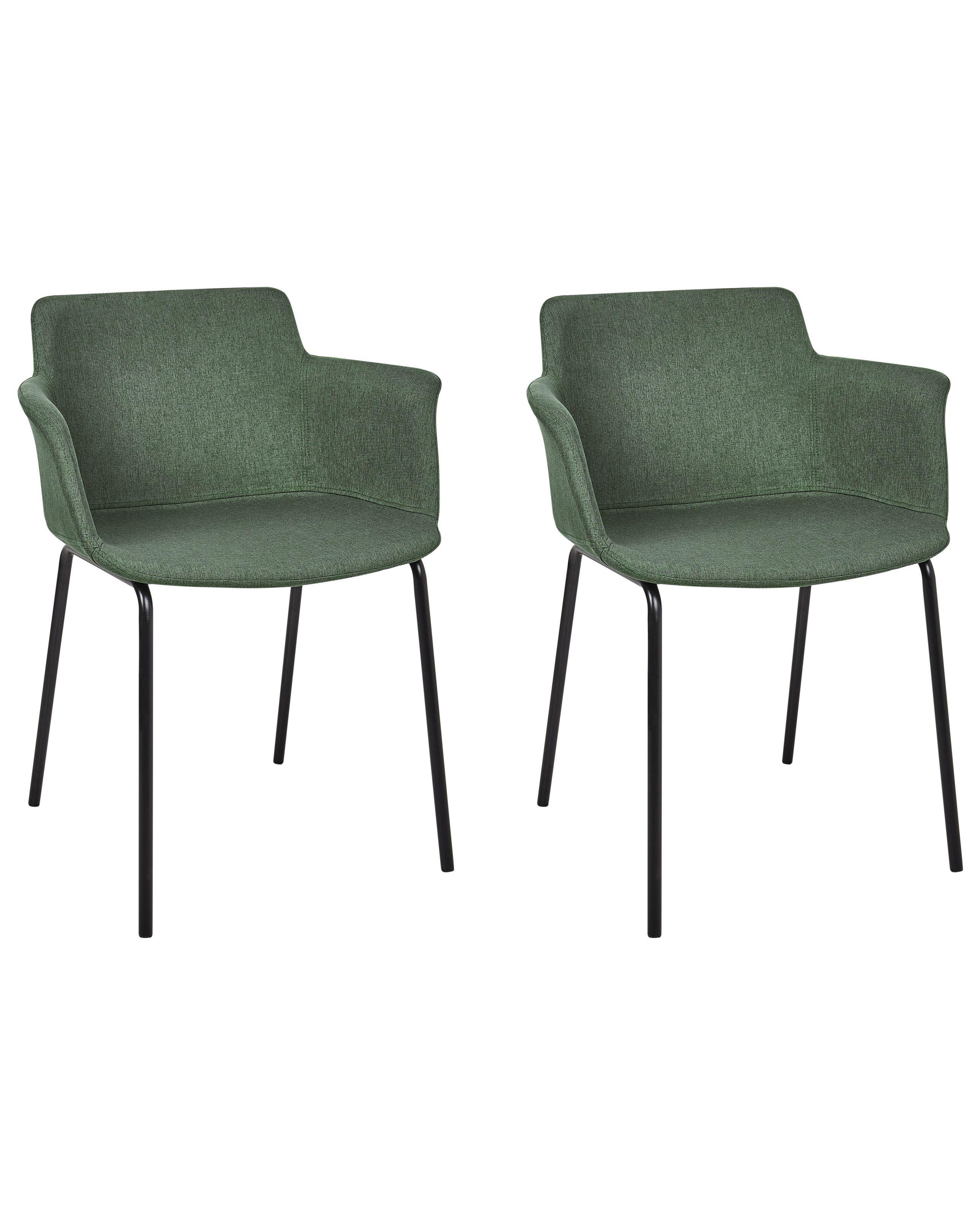 Set aus 2 Esszimmerstühlen mit Armlehnen. Dieses Paar schicker Esszimmerstühle vereint Stil und Funktionalität. Mit ihrem eleganten, weichen Stoffbezug in einem angenehmen, warmen Grünton werten sie jeden Essbereich auf. Die robusten Metallbeine sind in zeitlosem Schwarz gehalten und mit schützenden Beinabdeckungen versehen. Für zusätzliche Entspannung sorgen die bequemen Armlehnen.