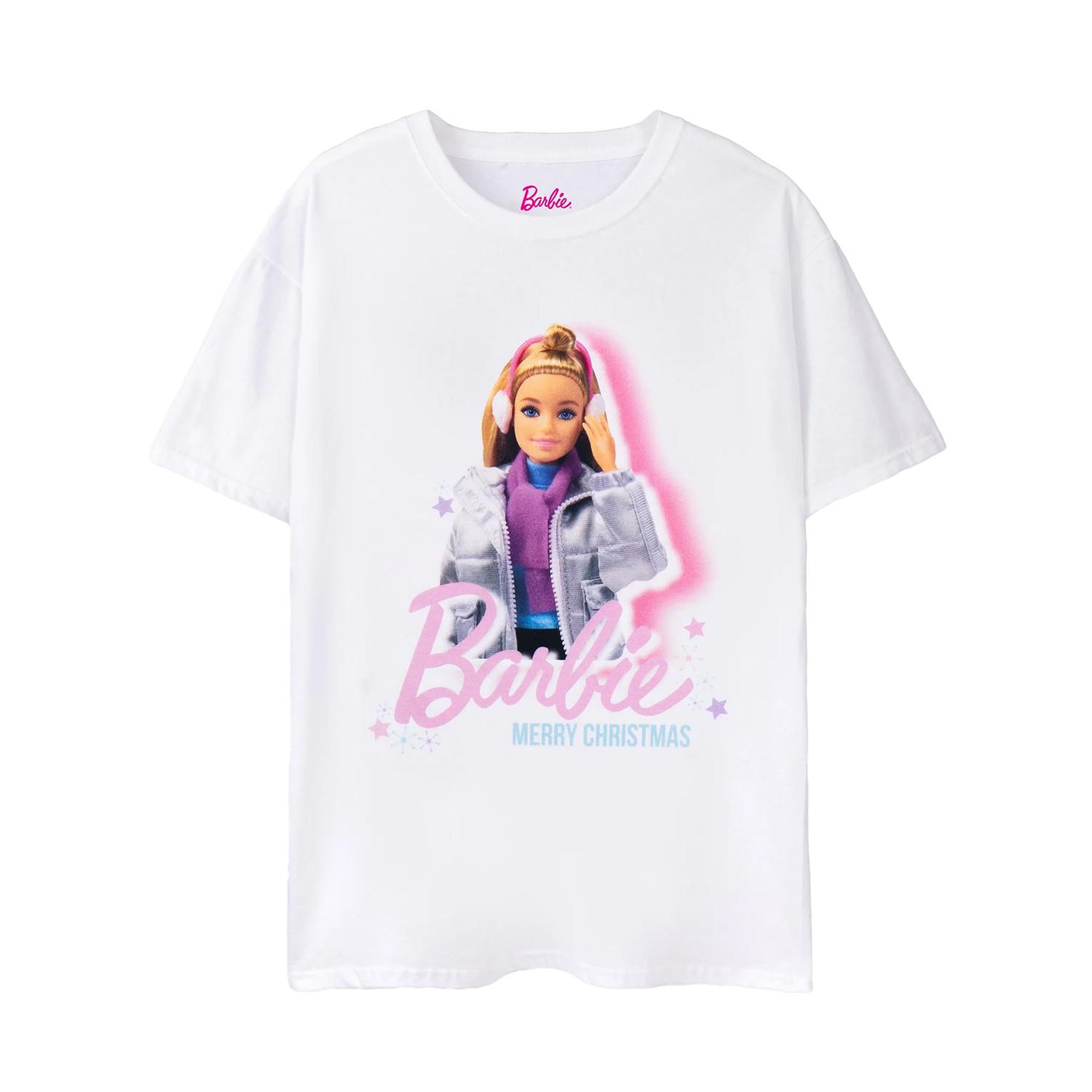 Dieses T-Shirt präsentiert ein festliches Barbie-Design, ideal für die Feierlichkeiten der Weihnachtszeit. Die Vorderseite des Shirts zeigt eine lebendige Grafik von Barbie in Winterkleidung und einer "Merry Christmas"-Botschaft, umgeben von verspielten Sternen.