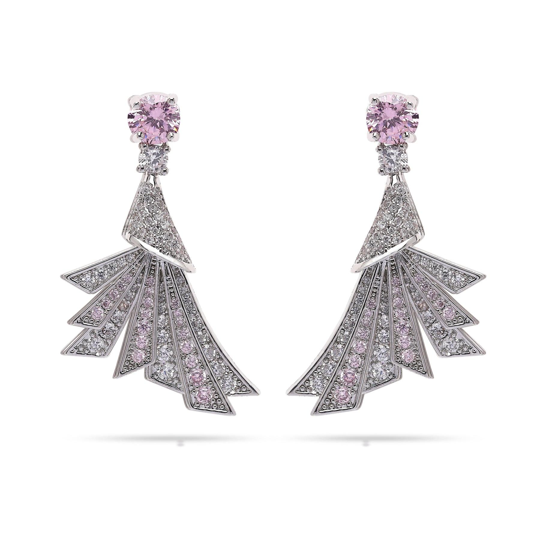 Diese von Art déco inspirierten Ohrhänger bestechen durch ihr gestuftes, geometrisches Design. Ein runder, rosafarbener Edelstein thront auf einer Kaskade aus kristallbesetzten, federförmigen Elementen. Die klaren Linien und die dezenten rosa Akzente machen sie zu einem eleganten und glamourösen Schmuckstück. Größe: 2,1 cm x 3,6 cm | Beschichtung: Rhodiumplattiert | Verschluss: Stecker und Rückseite