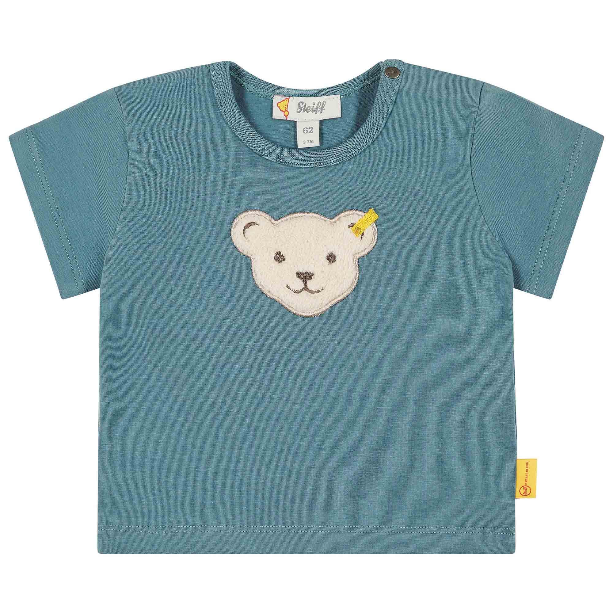 T-Shirt mit kurzen Ärmeln für Jungen und Mädchen von der Marke Steiff. Einfarbig mit Druckknöpfen am Rundhalsausschnitt und flauschigem Teddybär-Motiv. Weicher, elastischer Baumwoll-Jersey.