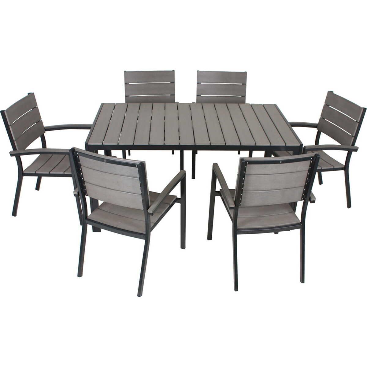 Hergestellt aus hochwertigem, pulverbeschichtetem Aluminium Attraktives hellgraues Finish für einen modernen Look Komfortable und pflegeleichte Sitzflächen aus Nonwood in Anthrazit Stilvolle Ergänzung für jeden Garten oder Terrasse Stapelstühle für einfache Lagerung und Flexibilität Stuhl: Maximale Belastbarkeit 120 kg Tisch: Maximale Belastbarkeit 50 kg