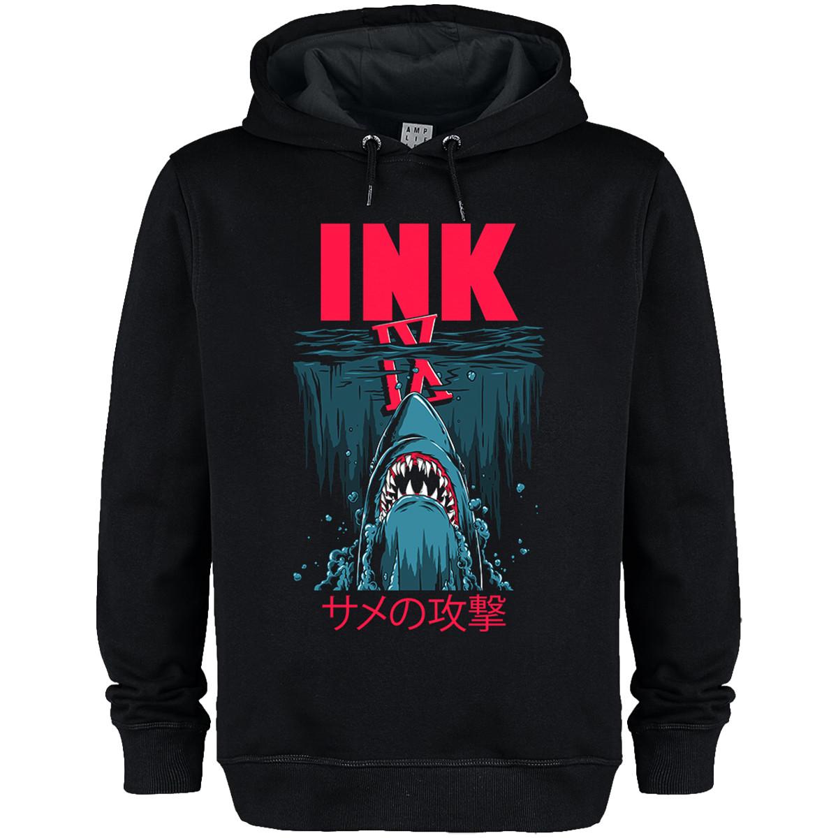 Dieser Kapuzenpullover zeigt einen auffälligen Grafikdruck, inspiriert vom ikonischen Jaws-Film. Das Design zeigt einen Hai, der aus dem Wasser auftaucht, mit dem Wort "INK" prominent darüber und japanischen Schriftzeichen darunter. Es ist eine bequeme und stilvolle Wahl für die Freizeit.