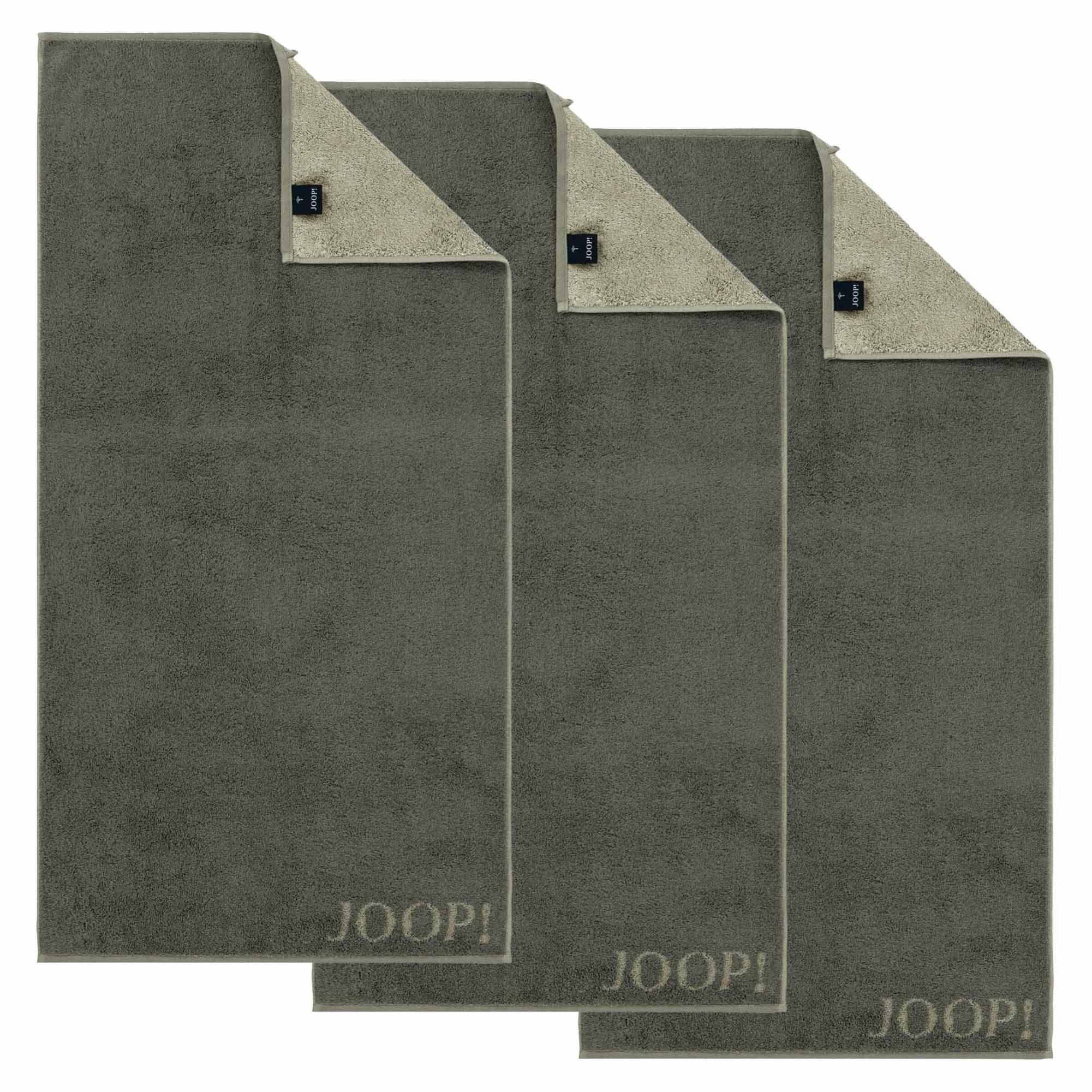 Drei elegante Handtücher von JOOP!. Aus reiner Baumwolle in flauschiger Walkfrottier-Qualität. Einfarbiges Design in Wende-Optik.