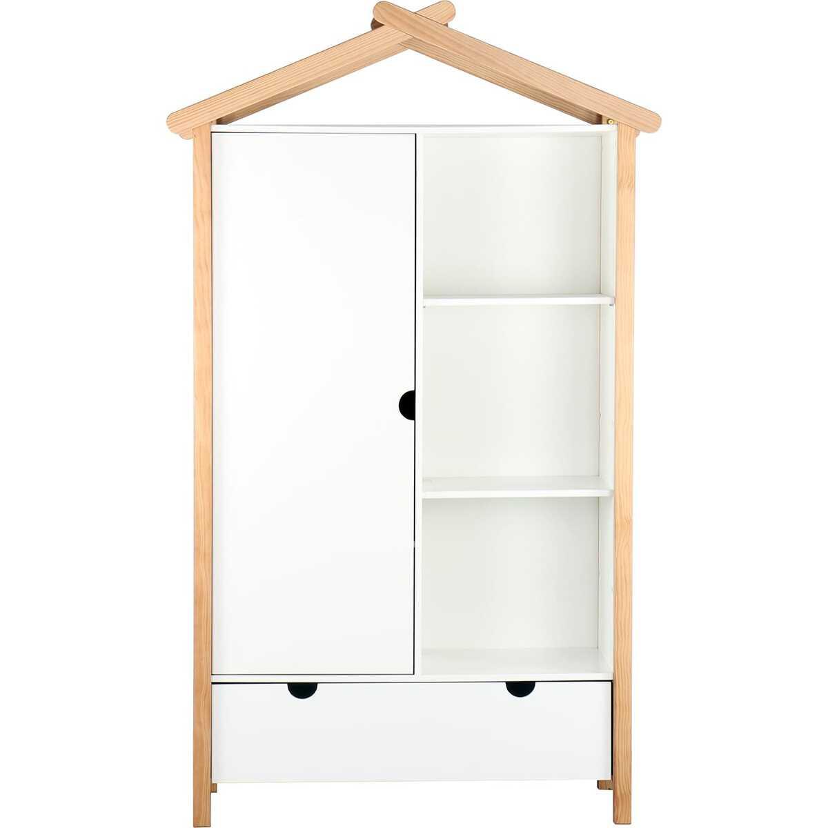 Dieser Kleiderschrank im hausförmigen Design zeigt, dass es in punkto Einrichtung für das Kinderzimmer auch ausgefallen geht. Teils offener und teils geschlossener Stauraum bietet jede Menge Platz, um Ordnung im Kinderzimmer zu halten. Hinter der linken Tür befindet sich eine Kleiderstange und ein weiterer Einlegeboden. Der Schrank besteht aus robustem Kiefernholz und bietet mit seiner skandinavisch schlichten Eleganz eine moderne Unisex Lösung für ein breites Spektrum an Kinderzimmereinrichtung und Altersstufen.originelles Designskandinavischer Chicpflegeleichte OberflächeSchublade mit Soft Close Funktionzeitloses Design