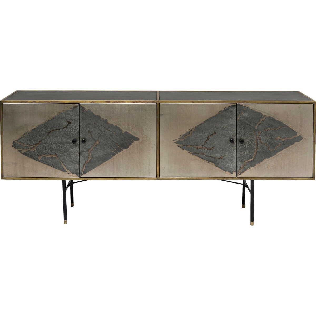 Ein Kunstwerk, mit dem man exklusiv und schöner wohnen kann! Aussergewöhnliches Sideboard aus Stahl, das mit seinem abstrakten Frontdesign als Meisterstück glänzt. Die archaischen Farben des Konsolenschranks Stahl, Schwarz und ein Hauch gedunkeltes Messing verleihen Mancha ein mystisches, erdiges Flair.Kunstvoll: breites Sideboard mit einzigartigen FrontenExklusiv: Das Design der Kommodentüren geht glatt als abstraktes Kunstwerk durchAufgeräumt: Hinter den beiden Doppeltüren findet sich reichlich Platz zum Verstauen, jede Seite mit je einem EinlegebodenSchwebend: Das schwarze, nach innen versetzte Gestell dieser Kommode lässt dieses Designermöbel leicht wirkenMultifunktional: dient als Anrichte im Essbereich und gibt als TV-Board dem Bildschirm eine würdige BasisProduktinformation Korpus und Fronten: Stahl lackiert, Fuss/Füsse: Stahl lackiert, Fachboden: Stahl lackiert, Front: jedes Stück ein Unikat, zerlegt, Füsse Höhe: 30 cm, 1 Fachboden je Seite
