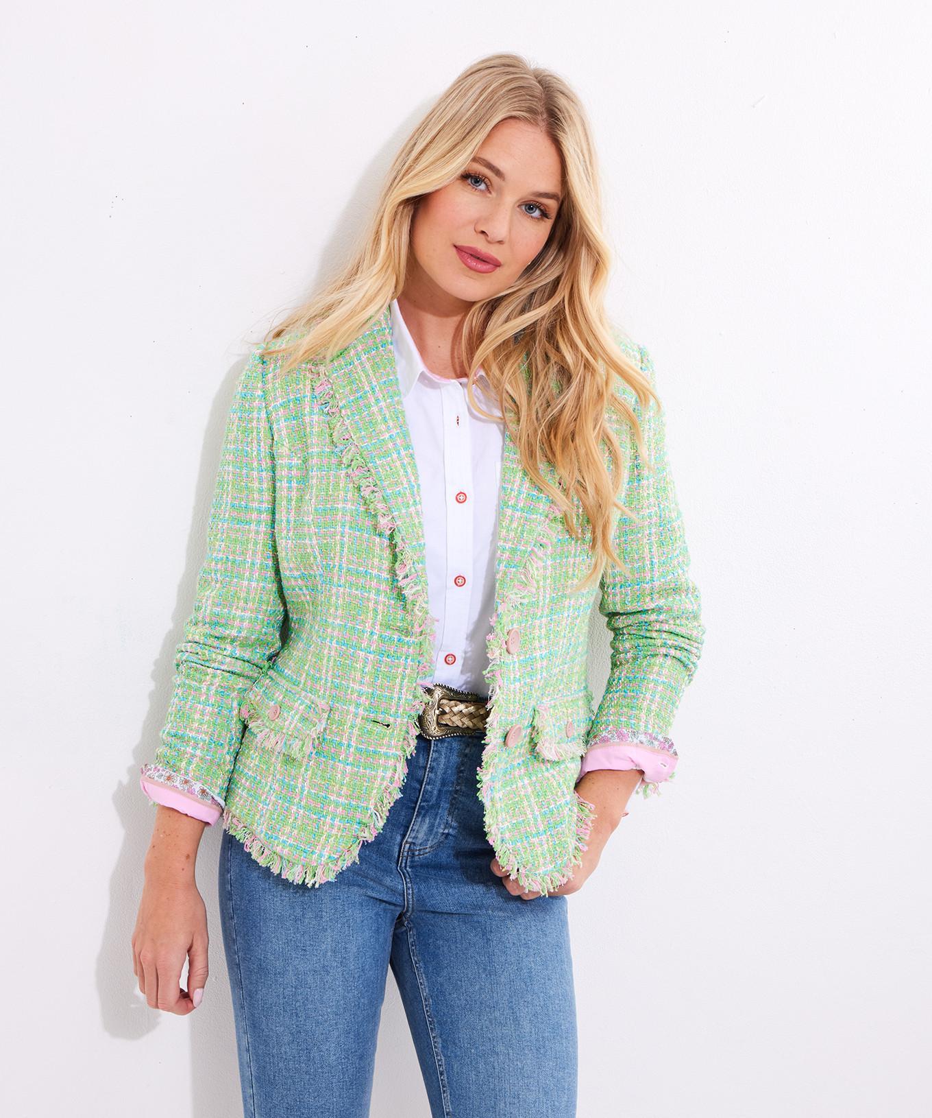 Diese Tweedjacke präsentiert ein lebhaftes Karomuster in Grün-, Rosa- und Blautönen, das einen frischen und stilvollen Look bietet. Das Design wird durch ausgefranste Kanten am Kragen, an den Ärmelbündchen und an den Taschen ergänzt, was einen modernen Akzent setzt. Es ist ein vielseitiges Kleidungsstück, das verschiedene Outfits aufwerten kann.