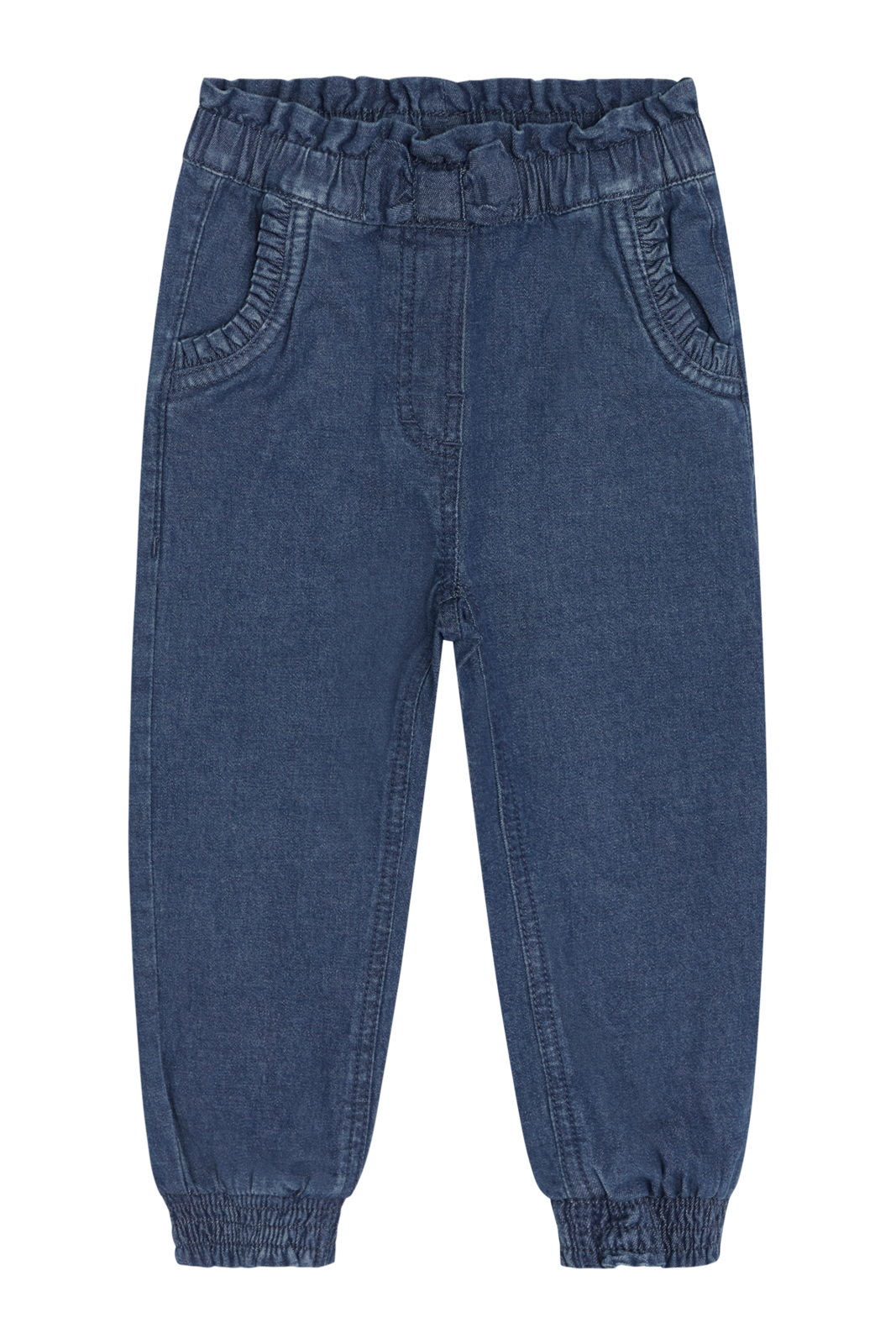 Hose in Denim-Optik mit Gummizug in der Taille und einer dekorativen Schleife in der vorderen Mitte. Das Modell hat Vorder- und Gesäßtaschen und die Vordertaschen sind mit Rüschen verziert. Mit verstellbarer Taille.