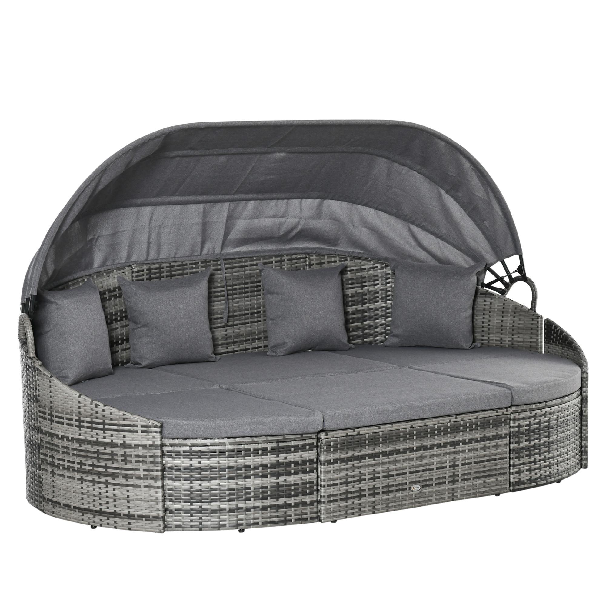 Trendiges und vielseitiges PE-Rattan-Lounge-Set von Outsunny. Das Set besteht aus 1 Dreipersonensofa, 2 Hockern und einer 1 Ottomane. Ein verzinkter Rohrrahmen sorgt für eine starke und robuste Struktur, umhüllt mit PE-Rattan, um einen Schutz gegen schlechtes Wetter zu bieten. Gepolsterte Kissen mit abnehmbaren und waschbaren Bezügen und einem großen Baldachin vervollständigen dieses Set.