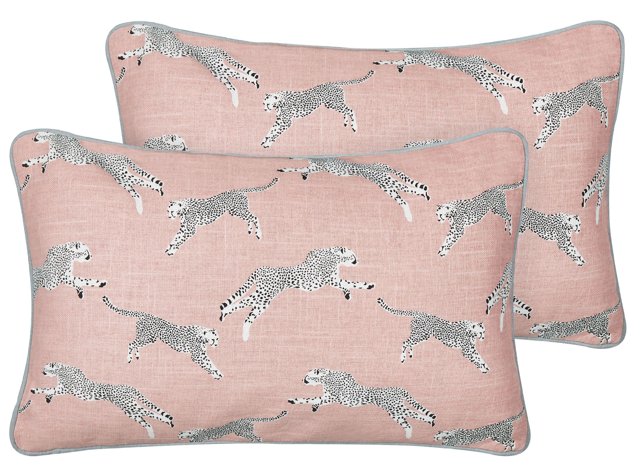 Baumwollkissen mit Gerpardenmuster im 2er Set. Legen Sie diese Kissen auf ein Bett oder ein Sofa, um einer eintönigen Einrichtung neues Leben einzuhauchen. Mit ihrem lebendigen Gepardenmotiv passen sie in jedes Kinderzimmer, können aber auch jedes moderne Wohnzimmer schmücken. Die gemusterte Vorderseite und die einfarbige Rückseite der Kissen bestehen aus Baumwolle. Zudem sind die Bezüge mit einer dekorativen Paspel versehen.
