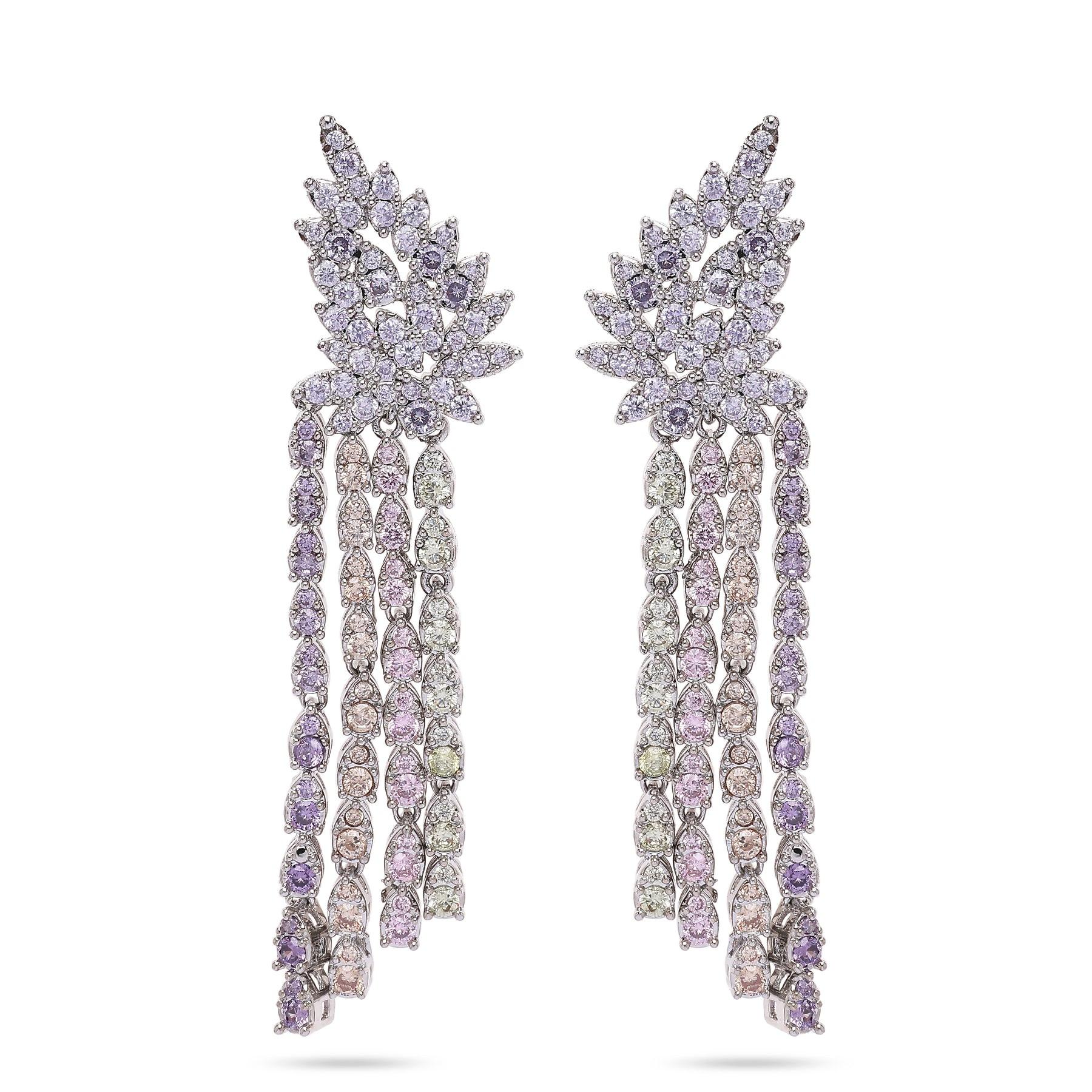 Diese bezaubernden Ohrringe bestechen durch ihr wunderschönes hellviolettes Design mit schimmernden Edelsteinen, die kaskadenartig angeordnet sind. Der obere Teil ziert ein zartes, blattartiges Cluster aus funkelnden Steinen, von dem mehrere herabhängende Stränge in sanften Pastelltönen wie Flieder, Rosa und Grün abgehen. Die filigrane Verarbeitung und die elegante Formgebung machen sie zum perfekten Schmuckstück für jeden besonderen Anlass! Größe: 1,5 cm x 5,8 cm | Beschichtung: Rhodiumplattiert | Verschluss: Stecker und Rückseite