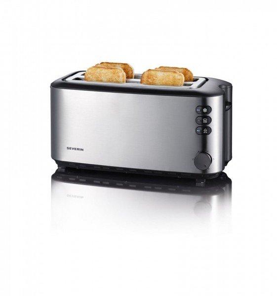 Für einen knusprigen Start in den Tag - der Automatik-Toaster AT2509 mit zwei langen Röstschächten zaubert Ihnen zum Frühstück gleichmässig gebräunte Brotscheiben.hochwertiges, wärmeisolierendes und doppelwandiges Edelstahl-GehäuseBrotscheibenzentrierung für die gleichmässige Bräunung beider Brotseitenintegrierter Brötchen-Röstaufsatz zur einfachen Zubereitung von Brötchen2 Langschlitz-Röstschächte für bis zu 4 BrotscheibenLeistung: ca. 1400WKnusper, knusper am Frühstückstisch - Geniessen Sie schon am Morgen lecker getoastete Brotscheiben mit Ihrem Lieblingsaufstrich oder -belag, ganz nach Ihrem Wunsch. Als Langschlitztoaster verfügt dieser Automatik-Toaster über zwei lange Röstschächte für je zwei Brotscheiben. Mit der Brotscheibenzentrierung wird hier von beiden Seiten eine gleichmässige Bräunung erzielt. Wählen Sie zwischen den verschiedenen Funktionen, wie Auftauen, Aufwärmen sowie Toasten, und beenden Sie den Vorgang mit den intuitiven Funktionstasten. Zusätzlich kann der Bräunungsgrad einfach über den Drehregler eingestellt werden. Wo es knuspert, fallen Krümel - Um die feinen Brotkrümel aufzufangen und entsorgen zu können, verfügt der Automatik-Toaster über eine integrierte Krümelschublade. Schnell und leicht herausgenommen ist das Gerät im Nu gereinigt.