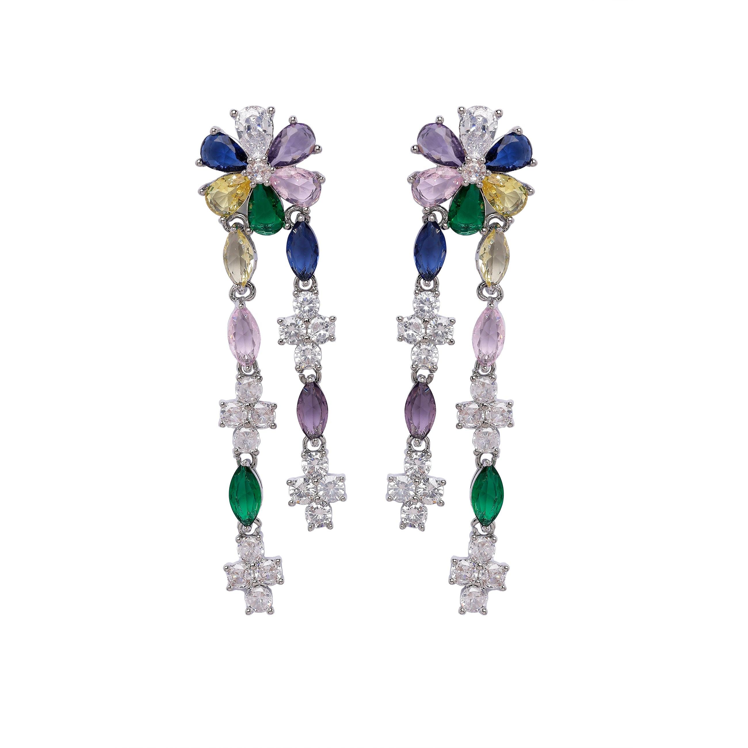 Diese farbenfrohen Ohrringe sind ein echter Hingucker! Die blütenförmigen Verzierungen sind mit einer schillernden Auswahl an bunten Steinen besetzt, während zarte Ketten daran herabhängen und so einen verspielten und auffälligen Look kreieren. Größe: 1,4 cm x 5,5 cm | Beschichtung: Rhodiumplattiert | Verschluss: Stecker und Rückseite