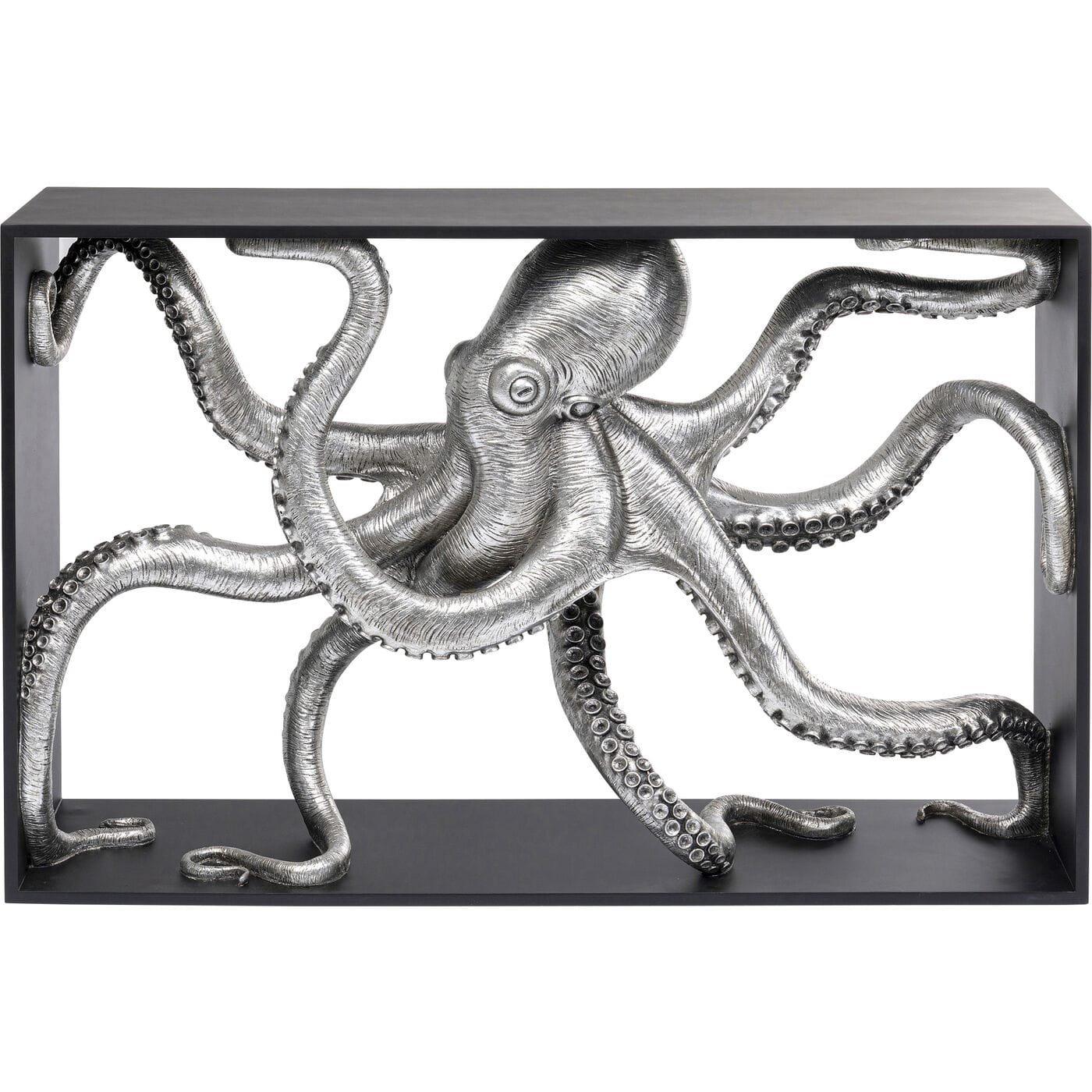 Die aufsehenerregende Konsole Calmar ist ein spannender Hingucker im Ferienhaus am Meer oder in einer luxuriös-maritim eingerichteten Stadtwohnung. Mit der strukturierten Oberfläche und den unzähligen Saugnäpfen wirkt die Oktopus-Figur beinahe echt. Sie ist aus Kunststein gefertigt, wodurch eine besonders detaillierte Darstellung des Meeresbewohners möglich ist. Der Konsolentisch misst 84,5 x 124 x 30 cm (H/B/T) und wird fertig montiert geliefert.Produktinformation Polyresin foliert (Oktopus), Rahmen: Sperrholz lackiert, 20 kg max. Belastbarkeit, montiert