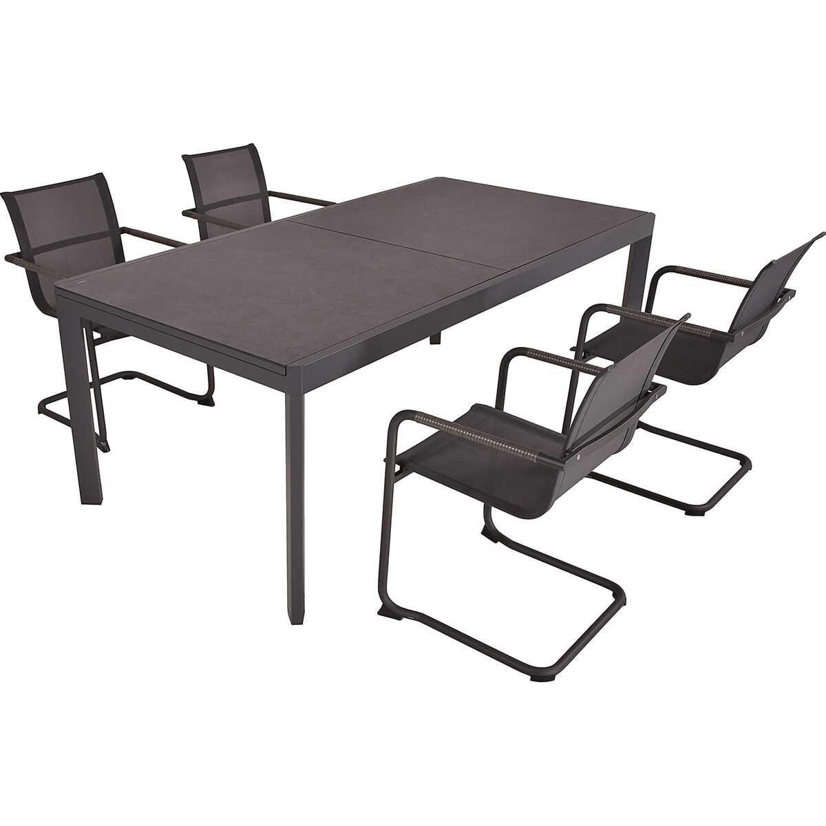 Robustes Gestell aus pulverbeschichtetem Anthrazit-Aluminium für Stabilität und Wetterbeständigkeit Glas-Tischplatte in Keramik-Optik für eine elegante Ästhetik und Langlebigkeit Vier Freischwinger Kendra-Stühle aus grauem Edelstahl mit pulverbeschichteter Oberfläche Sitz- und Rückenflächen sind mit wetterbeständigem grauem Kunststoffgewebe bezogen Freischwinger-Design der Stühle bietet eine angenehme Federung beim Sitzen Ausziehbarer Tisch für eine flexible Anpassung der Tischgrösse je nach Bedarf Maximale Belastbarkeit der Stühle: 120 kg Armlehnenhöhe: 65 cm