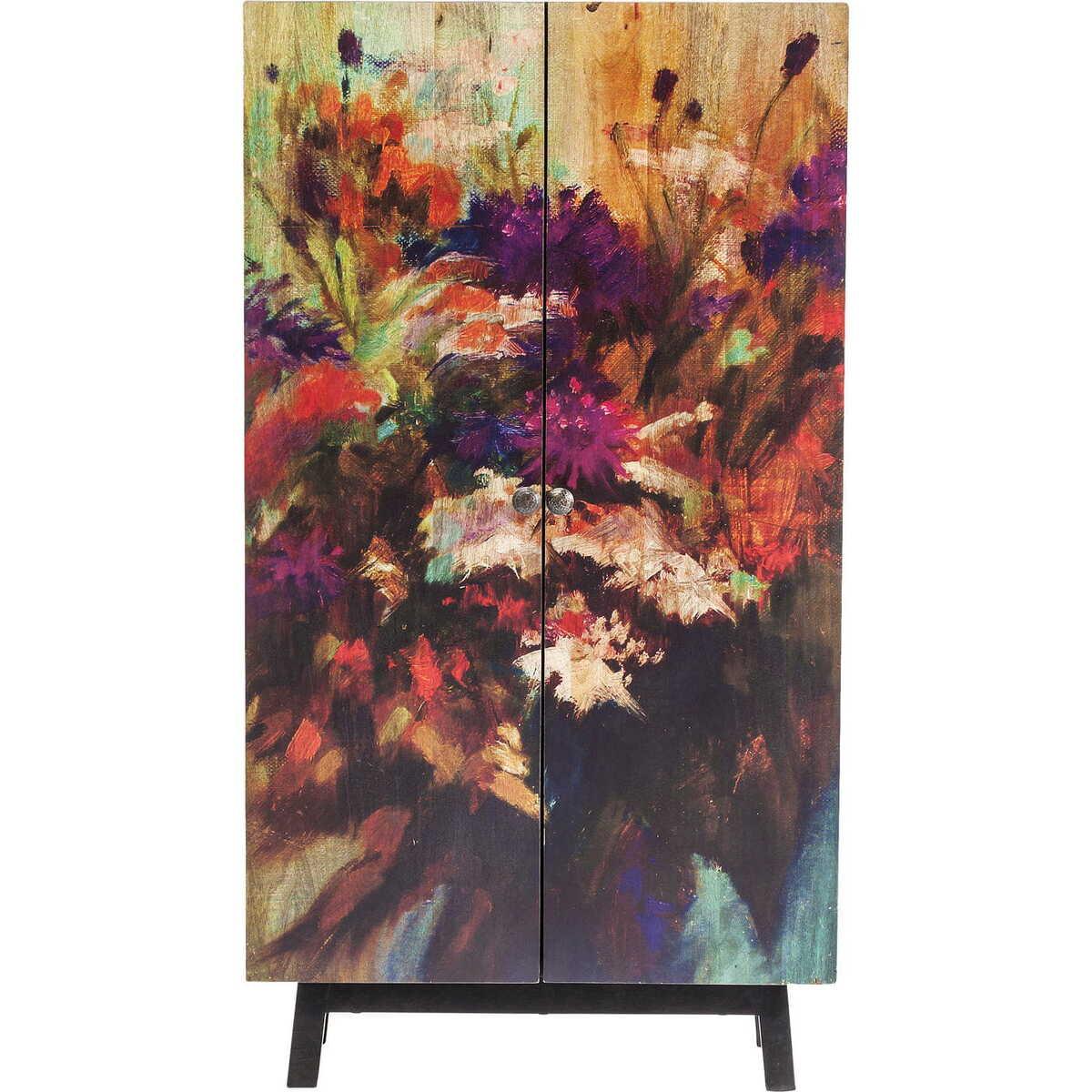 Florale Motive und fantasievolle Pflanzenwelten schmücken diesen Schrank aus Mangoholz und verleihen ihm eine poetische, fast träumerische Note. Der Wandschrank sieht nicht nur aus wie ein prachtvolles Gemälde, sondern bietet auch jede Menge Stauraum für Kleidung, Geschirr, Schuhe und vieles mehr. Kommt besonders in hellen, klaren Räumen gut zur Geltung und gibt jedem Raum ein stylishes Upgrade!Rechteckiger, kleiner Schrank mit schwarzem Korpus aus Mangoholz und einer Front mit Pflanzen- und BlumenmotivenEin Möbelstück, das mit seiner charmant-stimmungsvollen Optik pure Lebensfreude ins Ambiente zaubertDie fünf fest montierten Ablageflächen hinter den beiden Türen bieten jede Menge Stauraum für Bücher, gefaltete Kleidung, Geschirr & Co.Florale Motive und fantasievolle Pflanzenwelten verleihen dem Holzschrank eine poetische, fast träumerische NoteIdeal als Wäscheschrank im Schlafzimmer, Geschirrschrank oder Barschrank im Wohnzimmer, Schuhschrank im Flur oder als BüroschrankProduktinformation Mango Massivholz lackiert, Fachboden: fest montiert, 25 kg max. Belastbarkeit, jedes Stück ein Unikat, zerlegt, handbemalt
