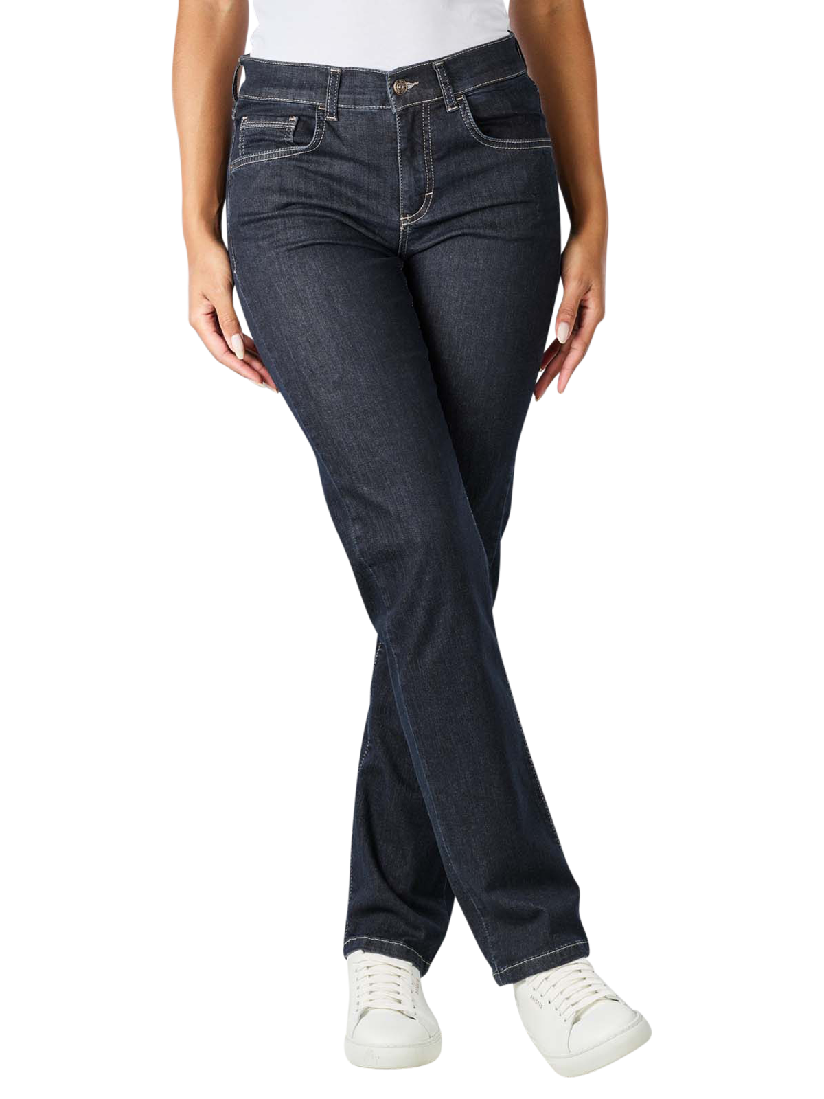 Die Angels The Light One Dolly Straight Fit Jeans ist eine Damenjeans im klassischen Schnitt. Die farblich abgehobenen Nähte zaubern einen modischen Look. Der Stretchanteil und der dünne Stoff zaubern eine schöne Silhouette und sorgen für ein bequemes Tragegefühl. Diese Five-Pocket-Jeans ist in der Passform Straight Fit geschnitten. Der Bund ist mittelhoch, Bein und Oberschenkel sind gerade.