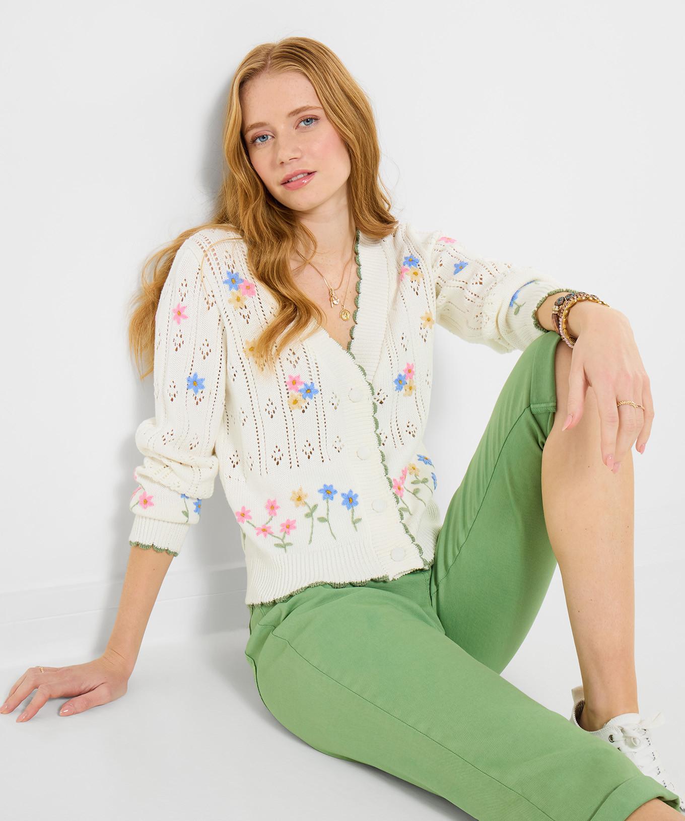 Der Muschelsaum und die feine Lochstrickstruktur verleihen dieser Strickjacke eine feminine Note.