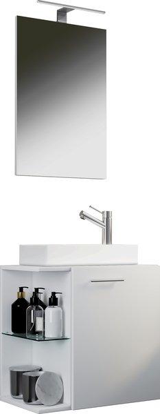 Das elegante Set besteht aus einem Spiegel sowie einem Waschbecken mit Waschbeckenunterschrank und bietet die perfekte Einrichtungslösung für WCs oder Gästetoiletten.
