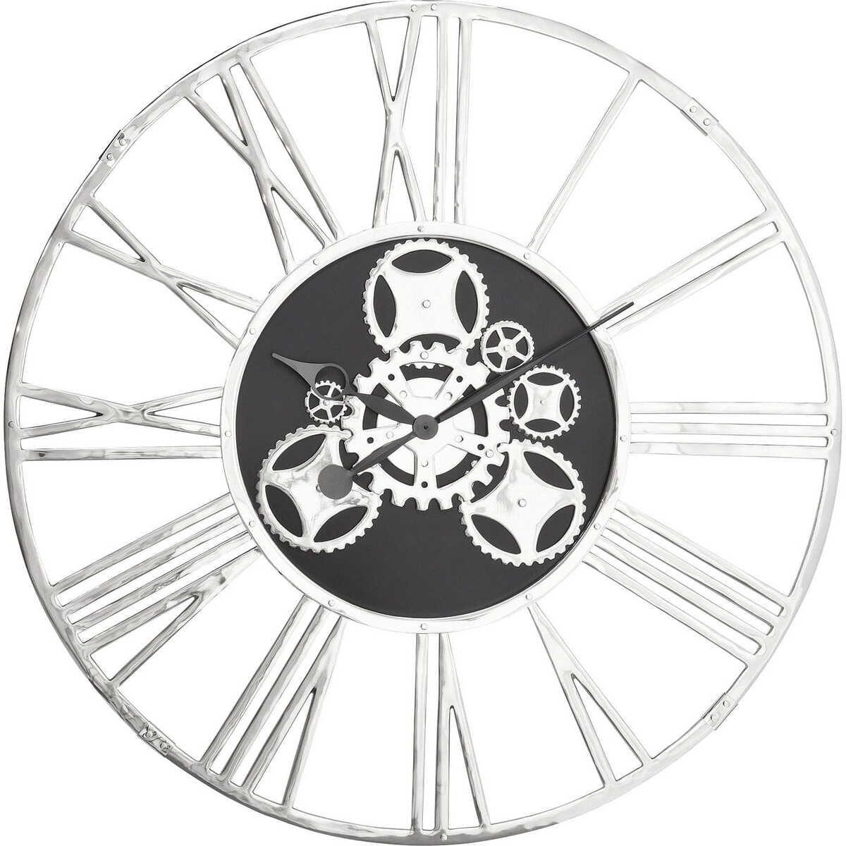 Elegante Wanduhr in ansprechendem Stilmix Die Wanduhr Gear besticht mit ihrem Mix aus antiken und modernen Details! Während die Formensprache, das Material und das freigelegte Uhrwerk für sehr moderne Akzente sorgen, verleihen die römischen Ziffern der Uhr ein charmantes antikes Flair. Die elegant geformten Zeiger runden den Look aus stilvolle Art und Weise ab. Der Durchmesser von 120 cm macht die Uhr zu einem ausdrucksstarken Objekt mit Blickfang-Garantie! Aus vernickeltem Aluminium und Edelstahl gefertigt.Produktinformation Zahnrad + Ziffernblatt: Aluminium vernickelt, Ringe: Edelstahl, Quarzuhrwerk, Batterie: 1x AA Mignon LR6 1,5 V (exkl.)