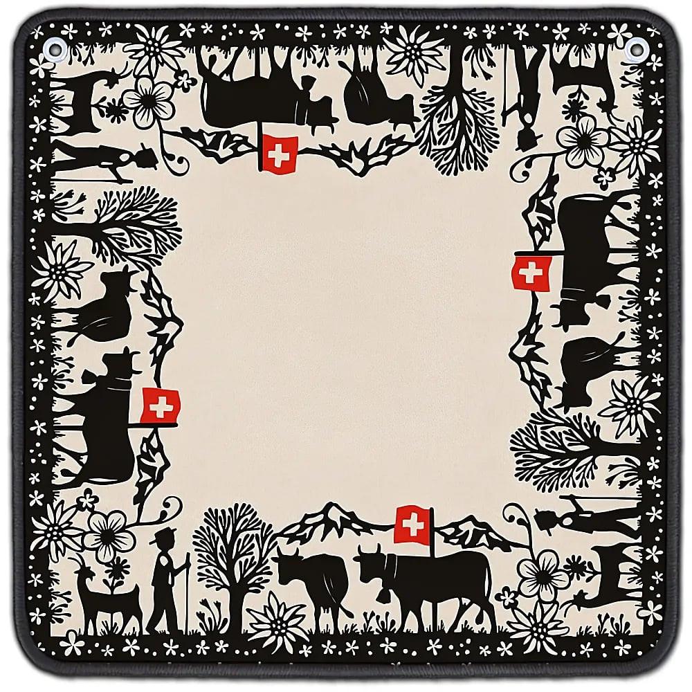 Dieser exquisite Jassteppich zeigt ein original Schweizer Scherenschnittmotiv der Künstlerin Jolanda Brändle. Mit einer Grösse von 65 x 65 cm aus hochwertigem Velours Niederflor, bietet er nicht nur eine ansprechende Optik, sondern ist auch funktional. Die Rückseite ist gummiert und rutschfest, was für eine sichere Spielfläche sorgt. Zudem sind zwei Kunststoffösen angebracht.