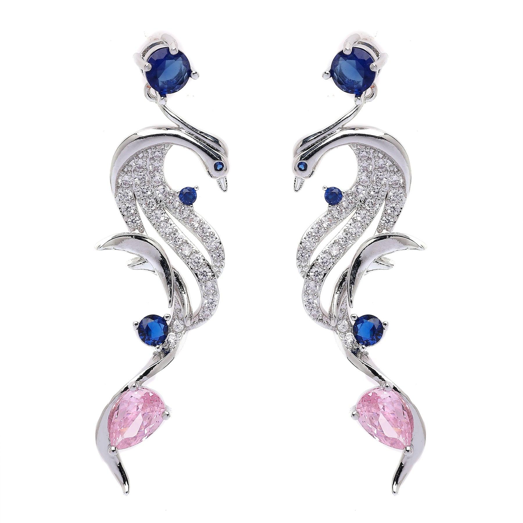 Diese kunstvoll gestalteten Ohrhänger verströmen eine mystische Eleganz. Geschwungene, kristallbesetzte Formen, die an stilisierte Flügel oder Meereswesen erinnern, werden von tiefblauen Steinen akzentuiert. Zarte, birnenförmige rosa Edelsteine runden das Design ab und schaffen eine faszinierende Mischung aus Textur, Farbe und fantastischer Inspiration. Größe: 1,6 cm x 5,0 cm | Beschichtung: Rhodiumplattiert | Verschluss: Stecker und Rückseite