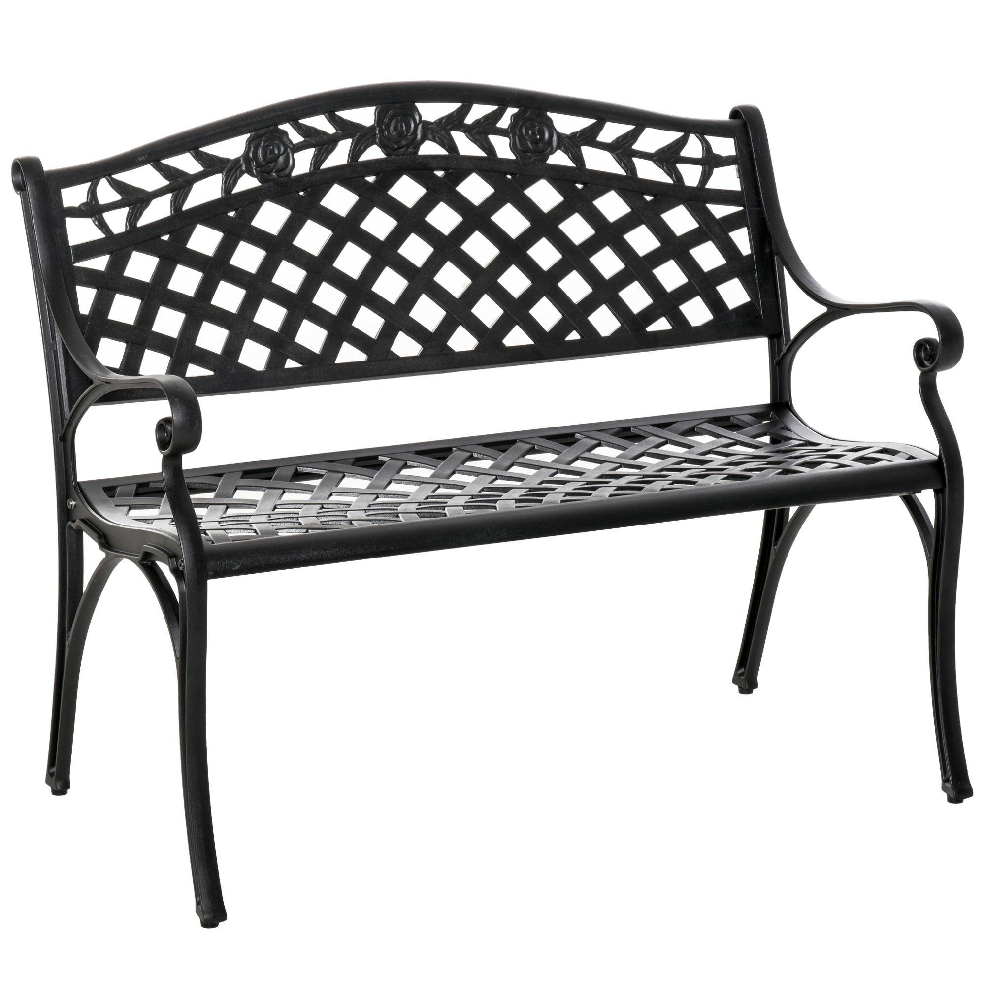 Diese dekorative Gartenbank von Outsunny in Schwarz ist mit ihrem nostalgischen Design und kunstvoller Verarbeitung ein absolutes Highlight unter den Gartenmöbeln und sollte nicht in Ihrem Garten fehlen. Die Bank bietet Platz für zwei Personen und hat einen witterungsbeständigen Metallrahmen. Die Gartenbank passt nicht nur in den Garten, sondern auch auf die Terrasse oder den Balkon, wo Sie durch Stabilität und Robustheit Ihnen lange Freude bringen wird. Die perfekte Wahl für einen gemütlichen Kaffee in der Sonne!