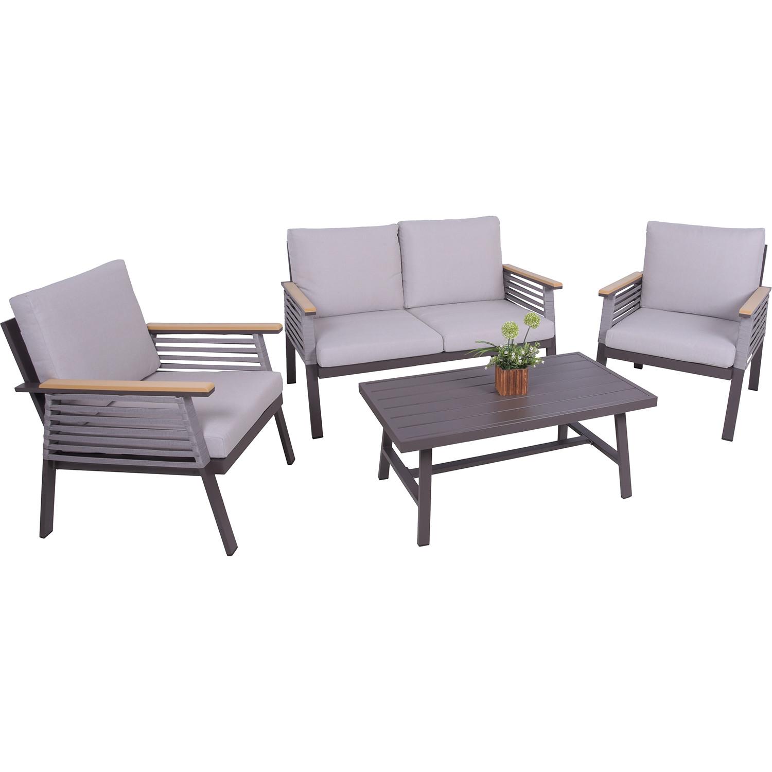 Hergestellt aus robustem, dunkelbraunem Aluminium und Non-Wood Bequem, dank den beigen Kissen Zeitgenössisches Design für eine moderne Optik Enthält ein geräumiges 2-Sitzer Sofa, zwei Sessel und einen Tisch Non-Wood-Details auf den Armlehnen für einen Hauch von Eleganz Widerstandsfähig gegenüber den Elementen Rückenlehnenhöhe von 49.5 cm für Komfort Tisch mit einer Unterkanthöhe von 38.5 cm