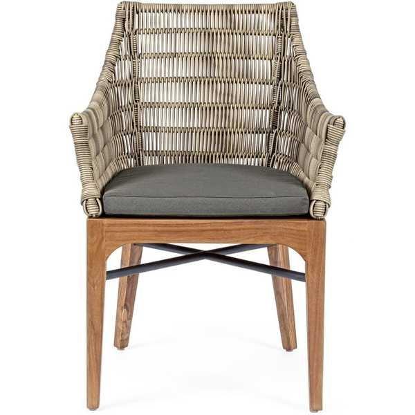 Rückenlehne aus pulverbeschichtetem (Polyester) Aluminium. Sitzfläche und Beine aus Teakholz (zertifiziertes Holz aus nachhaltiger Forstwirtschaft). Kunststoffgeflecht (rund 5mm). Kissen mit abnehmbarem sonnenbeständigem Olefin-Bezug (100% Polypropylen). Polsterung aus (Feuchtigkeitsbeständigem) quick dry foam.