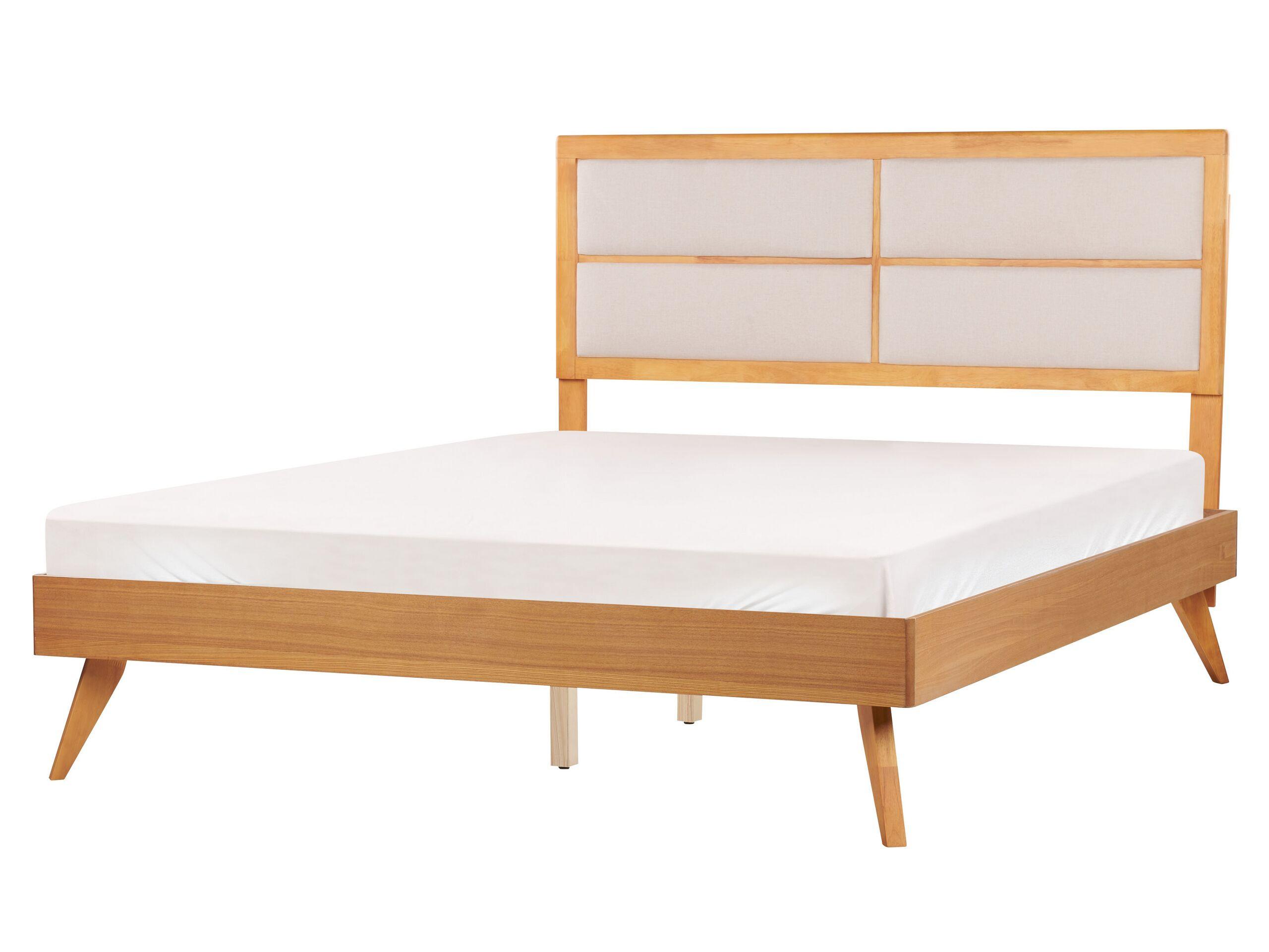 Bequemes Doppelbett mit dekorativem Kopfteil. Setzen Sie auf einfache, gerade Linien, die zum Verlieben schön sind. Das schlichte Bettgestell besteht aus furnierter MDF-Platte, die mit ihrer täuschend echten Holzoptik die Liege zu einer absolut trendstarken Bereicherung Ihres Schlafzimmers macht. Die schlichten, schräg aufgestellten Beine aus Gummibaumholz sorgen für hervorragende Stabilität und Widerstandsfähigkeit des Doppelbettes. Dank den hohen Füssen kommt das Bett auf eine angemessene Liegehöhe, so wird Ihnen das Zubettgehen und morgendliche Aufstehen angenehm gestaltet. Das mitgelieferte Kopfteil zeichnet sich mit seiner beigefarbenen Polsterung aus und lässt sich bequem in gewünschter Höhe anbringen.