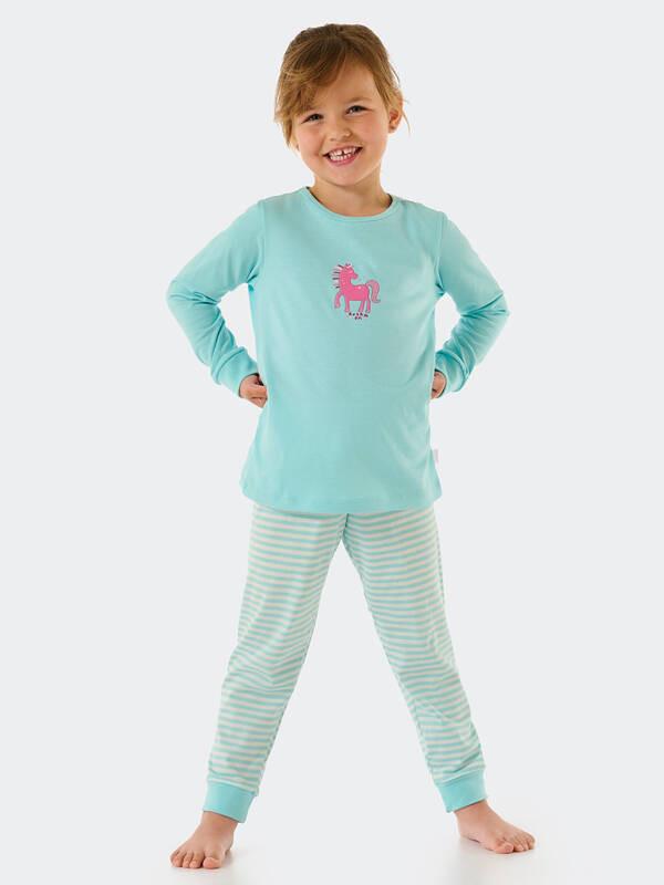 Langarm-Shirt in Türkis mit bedrucktem Einhorn-Motiv, lange Hose mit Ringeldruck