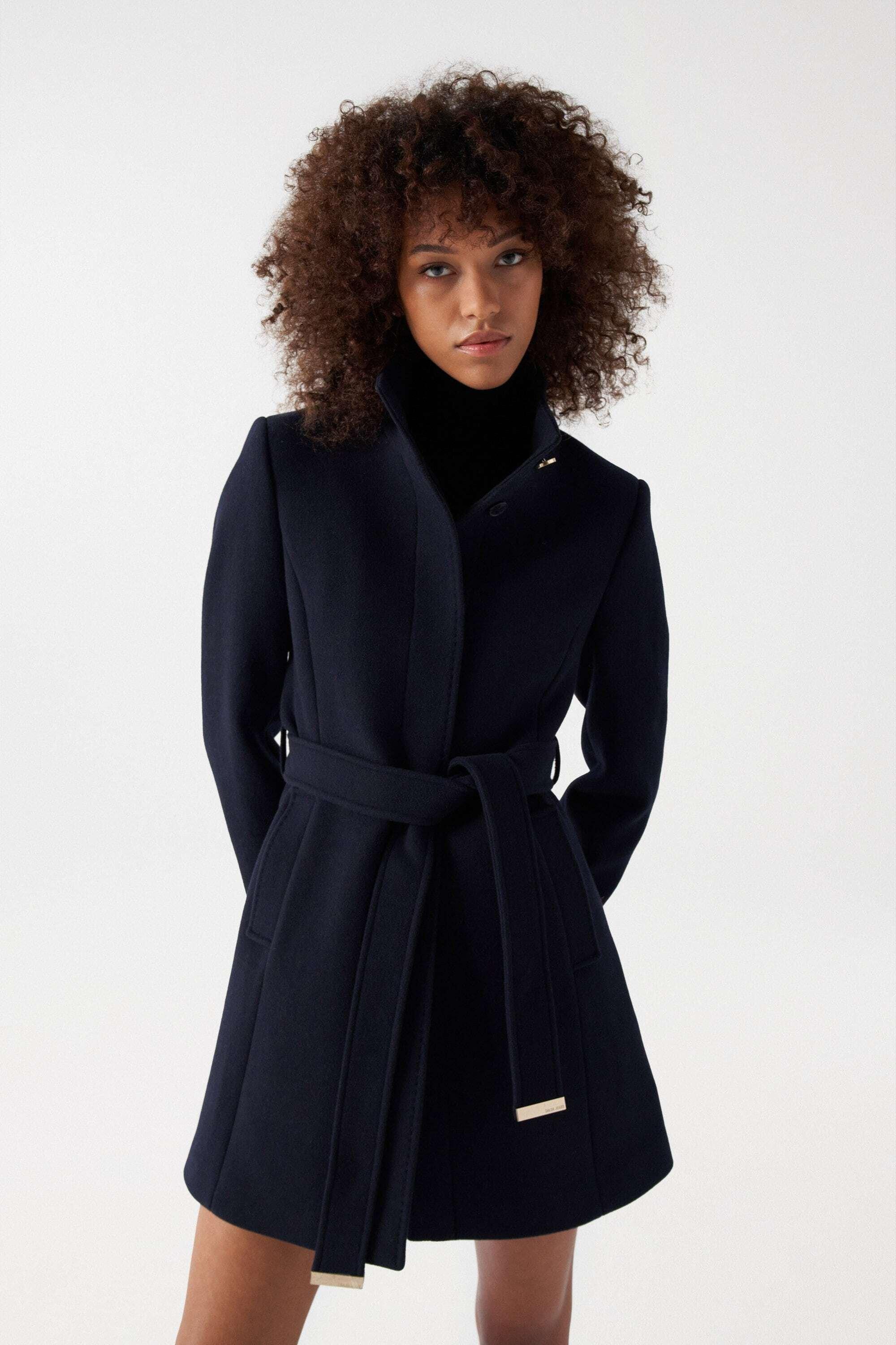 Ein marineblauer Wollmantel für Damen, der sich perfekt an die Silhouette schmiegt. Dieser schlanke, figurbetonte Mantel verleiht eine elegante Ausstrahlung. Der hohe Kragen mit Knöpfen und die langen Ärmel sorgen für zusätzliche Wärme und Stil. Die Knopfleiste vorne und die seitlichen Taschen verleihen diesem Mantel Funktionalität und einen modernen Touch.