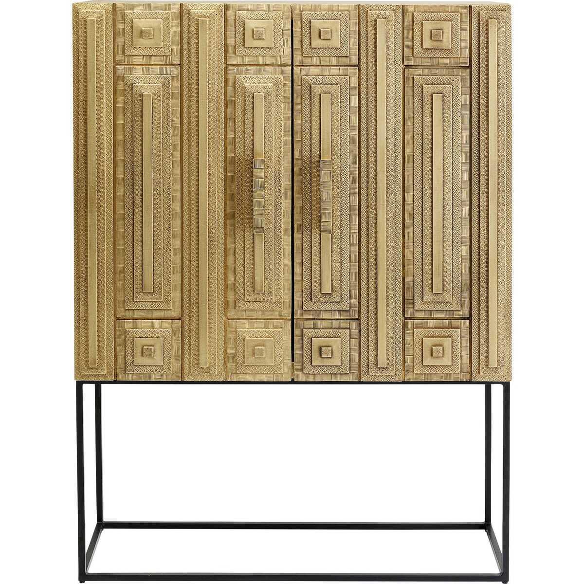 Ein Schrank auf hohen Beinen - das ist an sich schon eine Ausnahmeerscheinung. Marrakesch zeigt sich auch in seinen Details als aussergewöhnlich: angefangen beim gradlinigen schwarzen Untergestell bis hin zum dezent in Gold schimmernden Korpus. Wirklich umwerfend aber sind die Fronten auf den beiden grossen Türen mit dem dekorativen Spiel aus geometrischen Formen und feinen Mustern. Dabei kommen die Funktionen nicht zu kurz. Die Türen verfügen über eine angenehme Soft-close Funktion. Zudem ist in der Rückwand ein 5 cm breiter Auslass für Kabel. Marrakesch lässt uns träumen von märchenhaften Räumen wie aus Tausendundeiner Nacht. Oder eben vom neuen Centerpiece für die Wohnzimmerwand.Spektakulärer Hochschrank mit kunstvoller, reich mit Ornamenten verzierter Front - Kunsthandwerk auf höchstem NiveauWie ein Möbelobjekt aus einem orientalischen Souk und mit Vintage-CharmeEin sinnliches Statement-Möbel, das einem ganzen Wohnzimmer Glanz verleihtTeils von Hand hergestellt und ein Unikat, das von Handwerkskunst erzähltErfüllt viele Funktionen: Hausbar und Wäscheschrank, Flurmöbel und Schuh-SchrankProduktinformation Korpus: Mango Massivholz lackiert, Rückwand: Eukalyptus mitteldichte Faserplatte lackiert, Front: Stahl messing beschichtet, Seitenteile: Eukalyptus mitteldichte Faserplatte lackiert, Fuss/Füsse: Stahl pulverbeschichtet, Front: Teilweise Handarbeit, 15 kg max. Belastbarkeit, zerlegt, Soft-Close, D 50mm Auslass in Rückwand