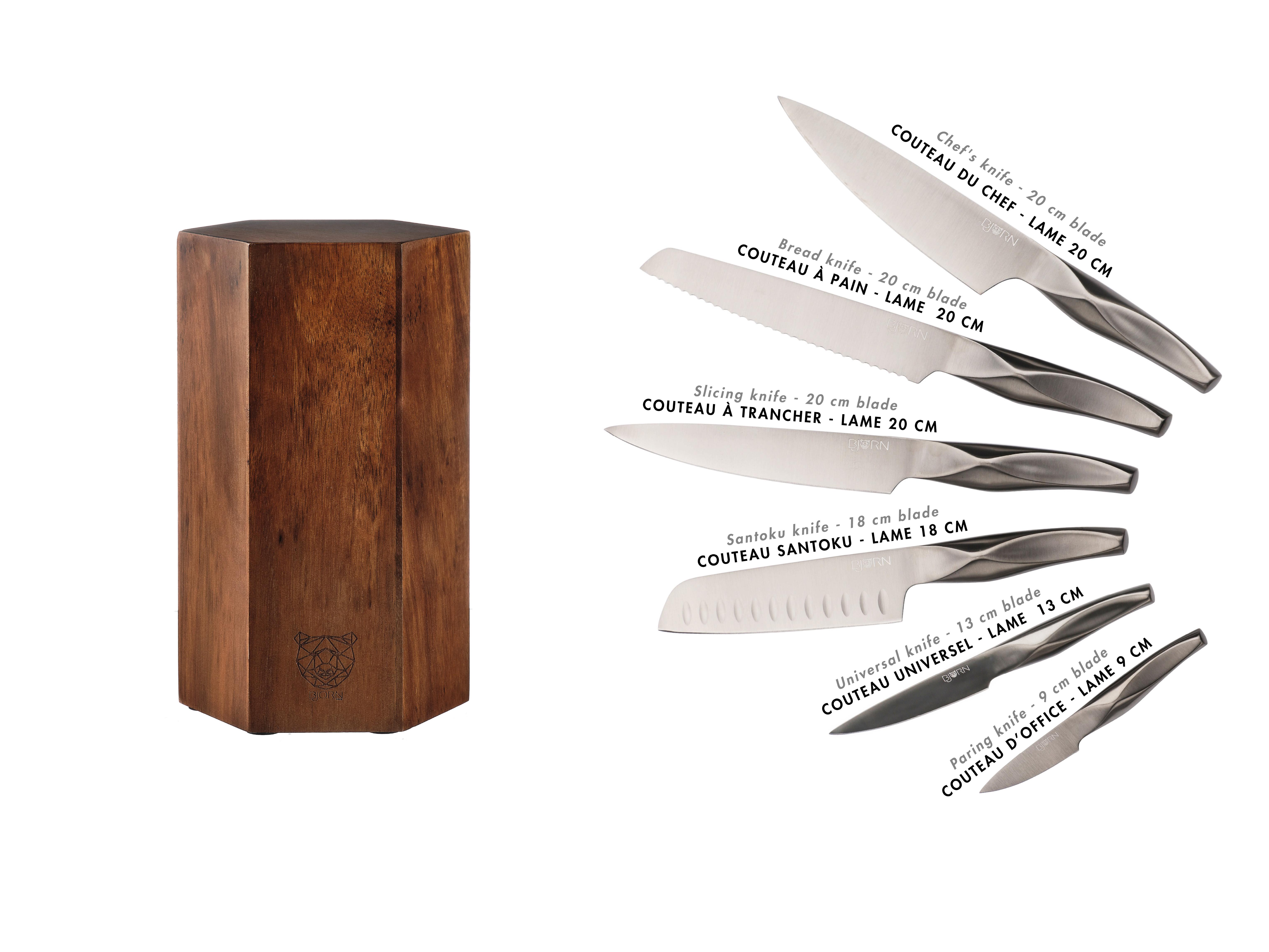 Enthält 1 Schälmesser (Klinge 9 cm) + 1 Universalmesser (Klinge 13 cm) + 1 Santoku-Messer (Klinge 17 cm) + Aufschnittmesser (Klinge 20 cm) + 1 Brotmesser (Klinge 20 cm) + 1 Kochmesser (Klinge 20 cm) + 1 Magnetischer Universalmesserblock