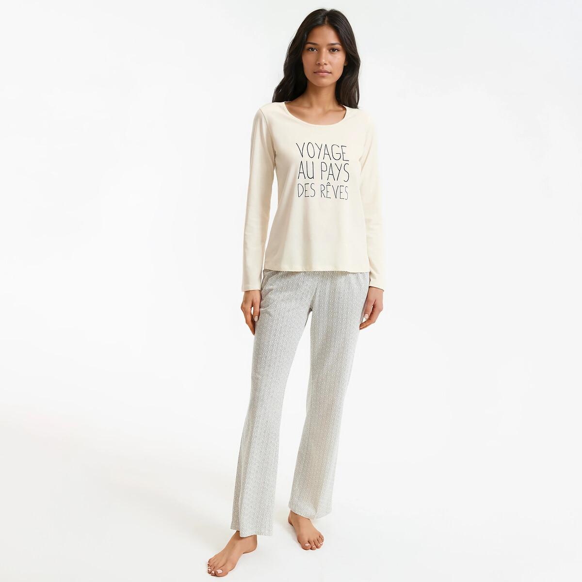Dieser langärmlige Pyjama ist aus weichem Baumwoll-Jersey gefertigt und bietet Komfort und Stil für entspannte Stunden zu Hause. Das Oberteil hat einen Rundhalsausschnitt und einen aufgedruckten Slogan, während die Hose mit einem passenden geometrischen Muster verziert ist.