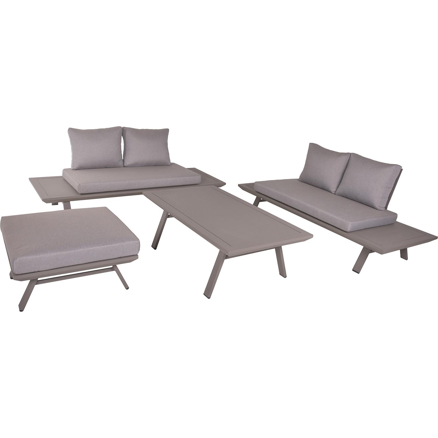 Zwei geräumige Sofas für optimale Entspannung Hocker bietet zusätzlichen Sitzplatz oder Fussstütze Tisch für Getränke und Snacks, für zusätzlichen Komfort Robuster Aluminiumrahmen für Langlebigkeit und Pflegeleichtigkeit Weiche Kissen in Taupe, aus hochwertigem, wetterfestem Polyester Zeitloses Design mit klaren Linien und ansprechender Farbkombination Maximale Belastbarkeit: Sofas 160 kg, Tisch 50 kg
