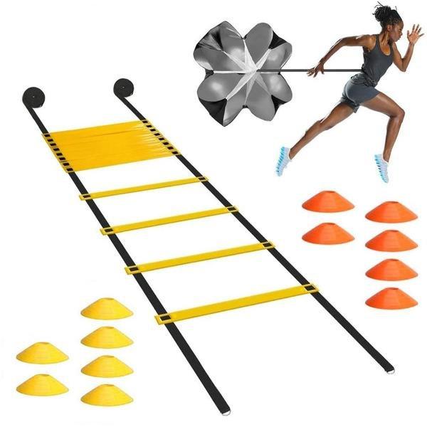 Set mit Trainingsleiter, Hütchen und Trainingsfallschirm. Mit diesem Set trainieren Sie Ihre Koordination, Beweglichkeit, Technik und Fitness.