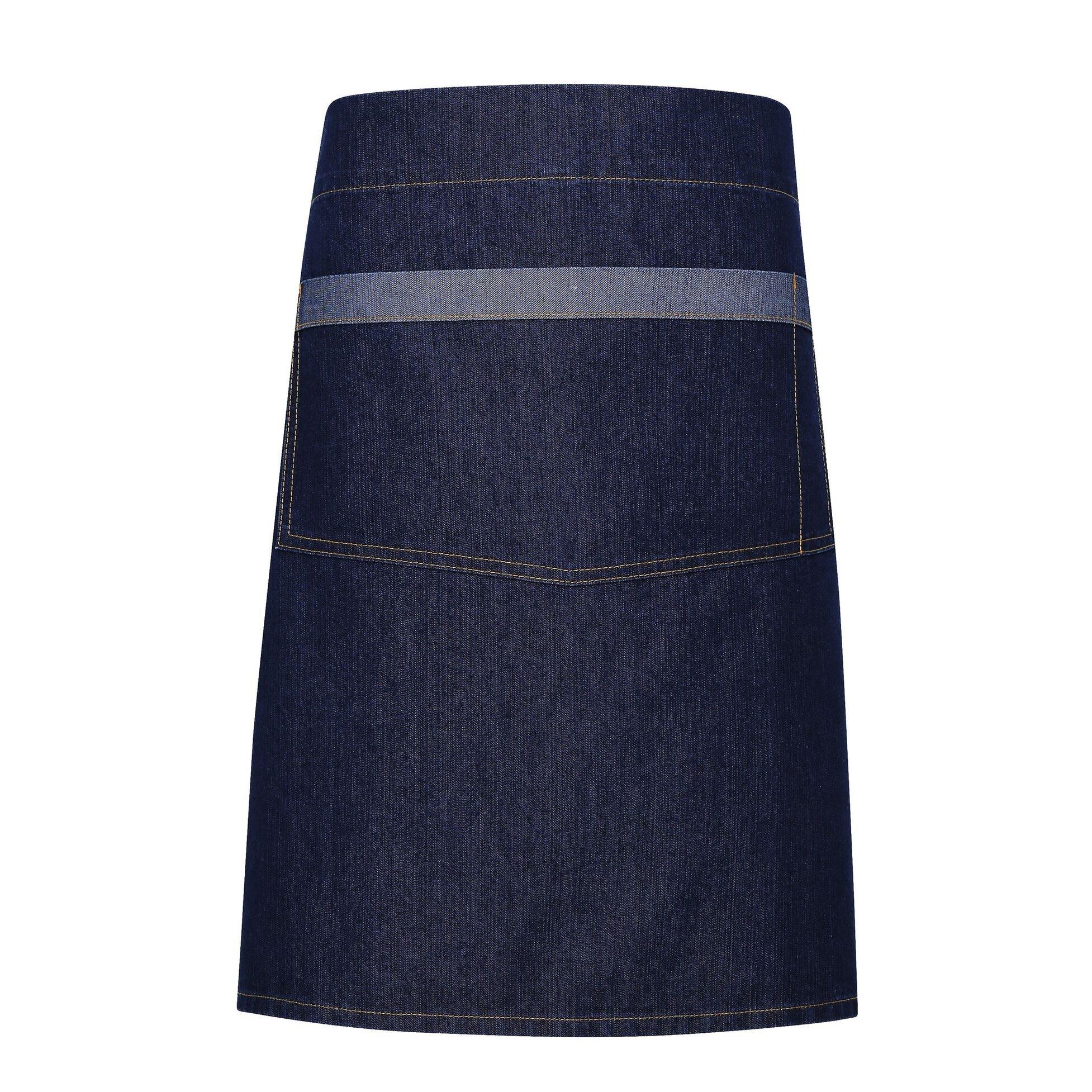 Mittlere Länge mit zwei Metall Ösen zur Befestigung der Schürze. Die große Tasche ist 36cm breit mit Stift Tasche. Kontrastsaum an Tasche und Riegeln gibt einen zweifarbigen Denim-Effekt. 50cm Länge x 70 Breite. Material : 70% Baumwolle, 30% Polyester.