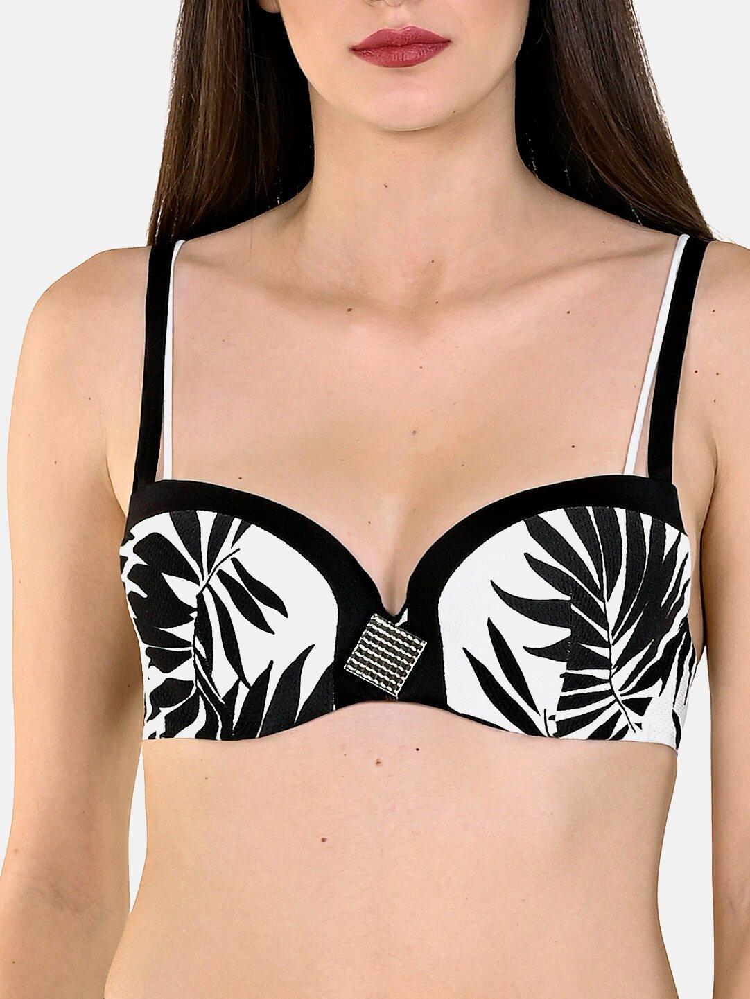 Dieses luxuriös elegante, vorgeformte Bikini-Oberteil mit Bügeln bringt die Frische des Sommers. Es ist mit eleganten Palmenblättern in Schwarz und Weiß auf einem feinen, strukturierten Piqué-Material bedruckt, das fein und angenehm zu tragen ist. Der dekorative Schmuck am Dekolleté ist abnehmbar und sorgt für zusätzliche Eleganz. Es verfügt über verstellbare, zweifarbig gefütterte Träger auf der Vorderseite und versteckte Bügel für einen nahtlosen Look.