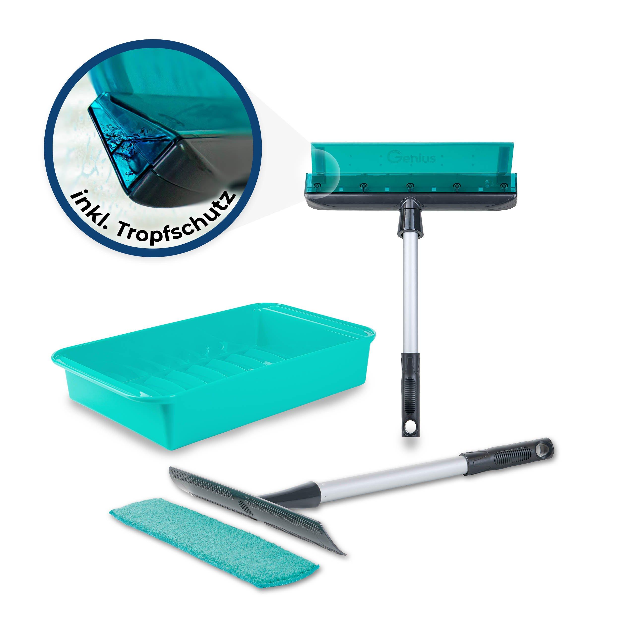 Nutzen Sie das innovative Zubehör und geniessen Sie Ergebnisse wie beim Profi. Reinigen Sie Fenster, Autoscheiben, Spiegel, Fliesen uvm. mit dem Genius Fensterwischer. Die Bedienung ist denkbar einfach. In der Wanne können Sie eine Lösung aus Wasser und etwas Reinigungsmittel vorbereiten.