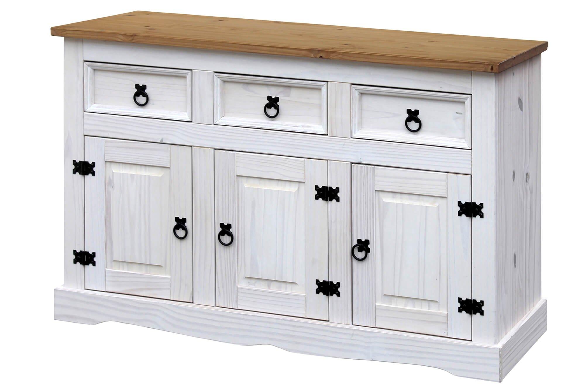Die Kommode ist aus massiver Kiefer im rustikalen Stil gefertigt. Die Oberfläche ist in weissem Farbton gewachst, die Deckplatte ist in einem warmen Honigton gewachst. Die Kommode bietet in 3 Schubkästen und hinter 3 Türen mit je einem Einlegeboden viel Stauraum. Die Sockelleiste hat eine geschwungene Form. Die Anrichte ist ein absoluter Hingucker für Ihr Wohn- und Esszimmer oder Ihre Diele. Die schwarz lackierten Metallverzierungen geben dieser Anrichte das gewisse Extra.im mexikanischen Landhaus-Stilrustikale Oberflächemit schwarzen Beschlägen3 Schubladen, 3 Türenje 1 Boden hinter den TürenProduktinformationen: je 1 Boden hinter den Türen, Schubladeninnenmasse (BxTxH) 31 x 31,5 x 12 cm