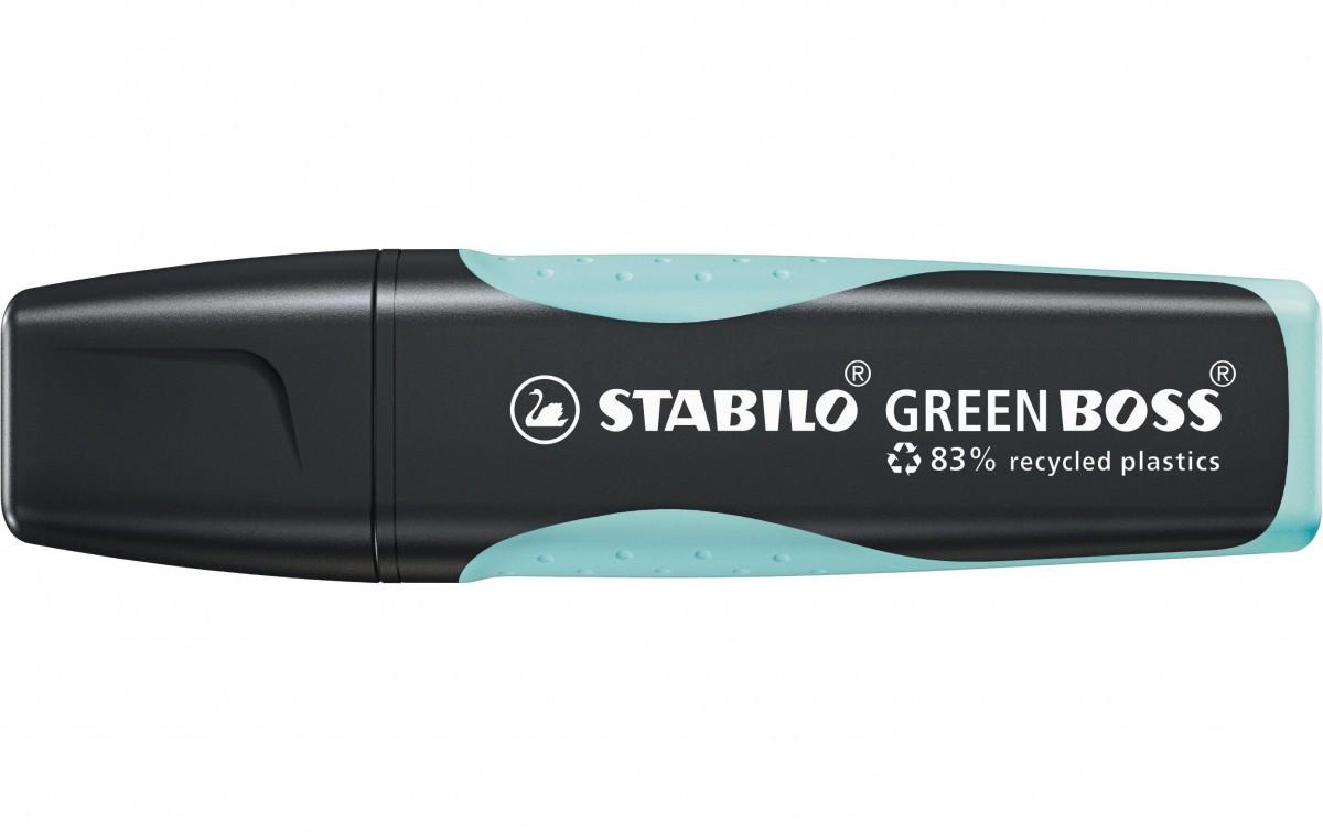 GREEN BOSS - Textmarker Der STABILO GREEN BOSS Pastell kombiniert Qualität mit Nachhaltigkeit und ist die perfekte Wahl für alle umweltbewussten Kunden. Hergestellt aus 83% recyceltem Kunststoff, um die natürlichen Ressourcen zu schonen. Nachhaltig markieren in zarten Farben. Textmarker für Schüler, Studenten, Lehrer und Büroangestellte mit Umweltbewusstsein. STABILO Anti-Dry-Out Technology: 4 Stunden Austrockenschutz für konzentriertes Arbeiten. Stylisches Design mit rutschfester Griffzone. Tinte auf Wasserbasis. 2 Strichstärken 2 + 5 mm. hergestellt aus 83% recyceltem Kunststoff patentierte STABILO® Anti-Dry-Out Technologie bietet vier Stunden Austrocknungsschutz rutschfeste Griffzone Tinte auf Wasserbasis, lichtbeständig gegeben