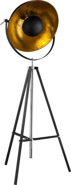Diese schwarze, dreibeinige Stehlampe, der Serie Xirena, besticht durch ihre auffällige, originelle Optik. Der Schirm ist schwenkbar und innen goldfarben. Ausserdem ist diese Lampe höhenverstellbar, wird durch einen On-Off-Schalter bedient und verfügt über eine E27 Fassung, für die ein Leuchtmittel bis zu einer Leistung von 60 Watt frei gewählt werden kann.